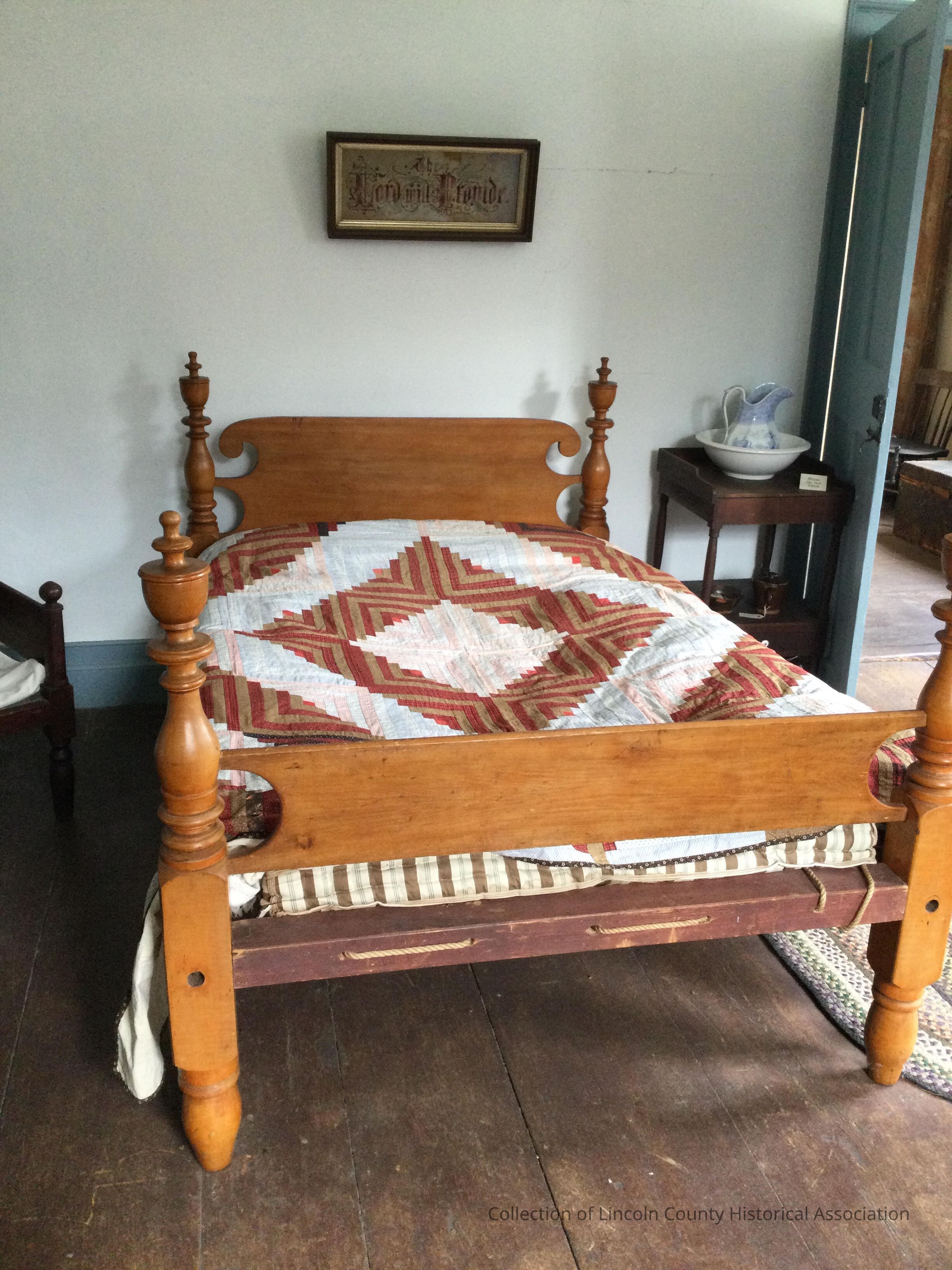 Maple bed with four posts, head and foot boards and with rope mattress supports. Posts capped with urn turningsMade/Created