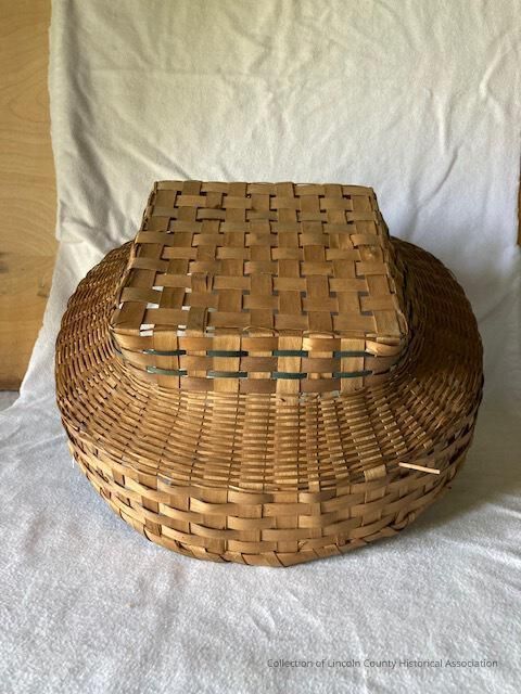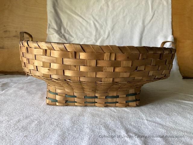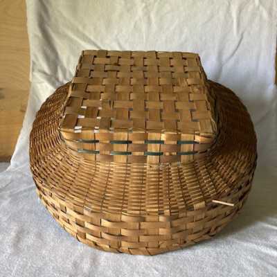 Native American Wabanaki open sewing basket with two splint handles. Bottom is square with four rows of splints. Base is then widened and rounded.Made/Created