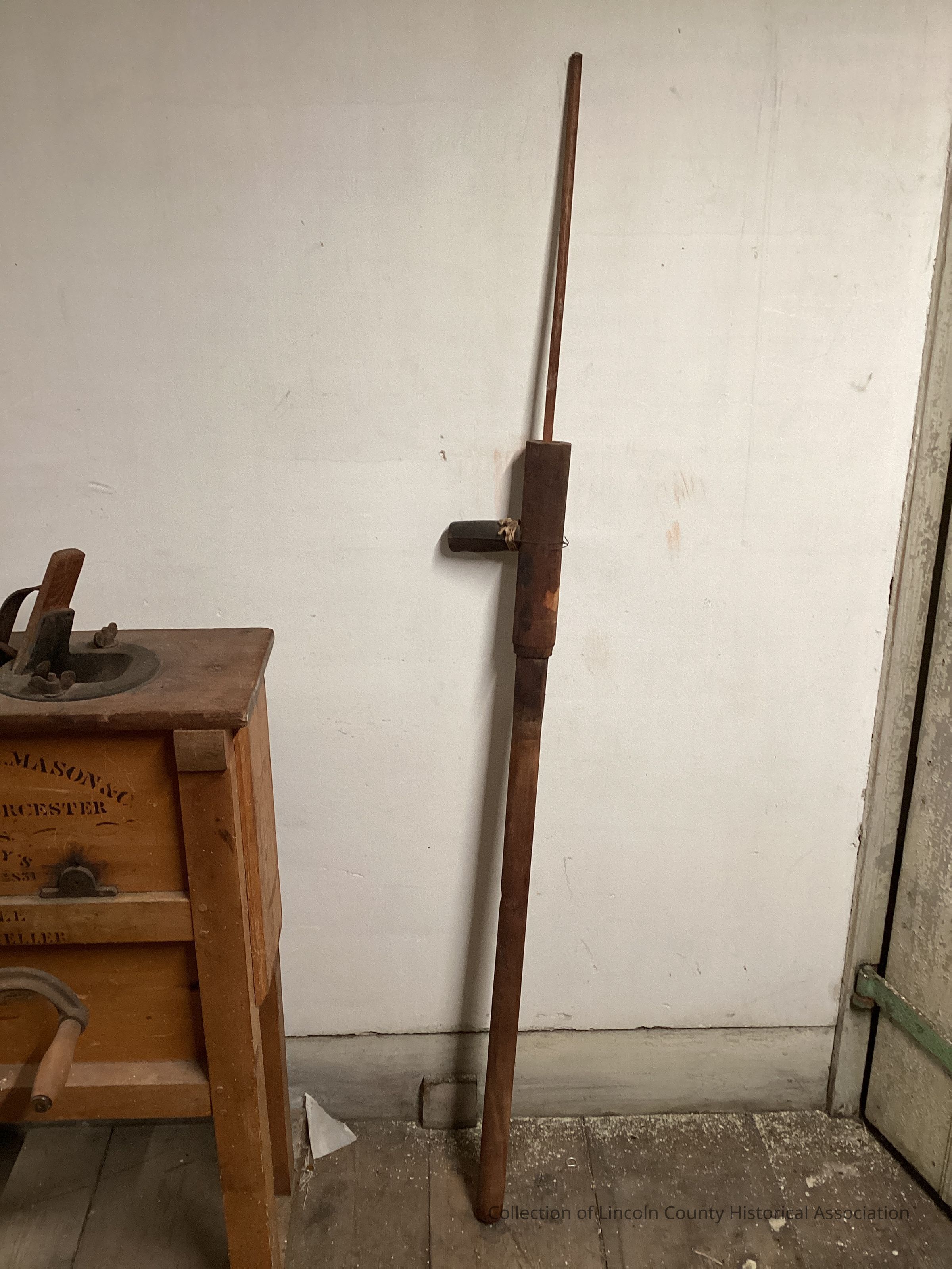 Wooden bilge pump consisting of a long, thin, hollow wooden tube inserted into a shorter but wider tube that has a round hollow block attached.Made/Created