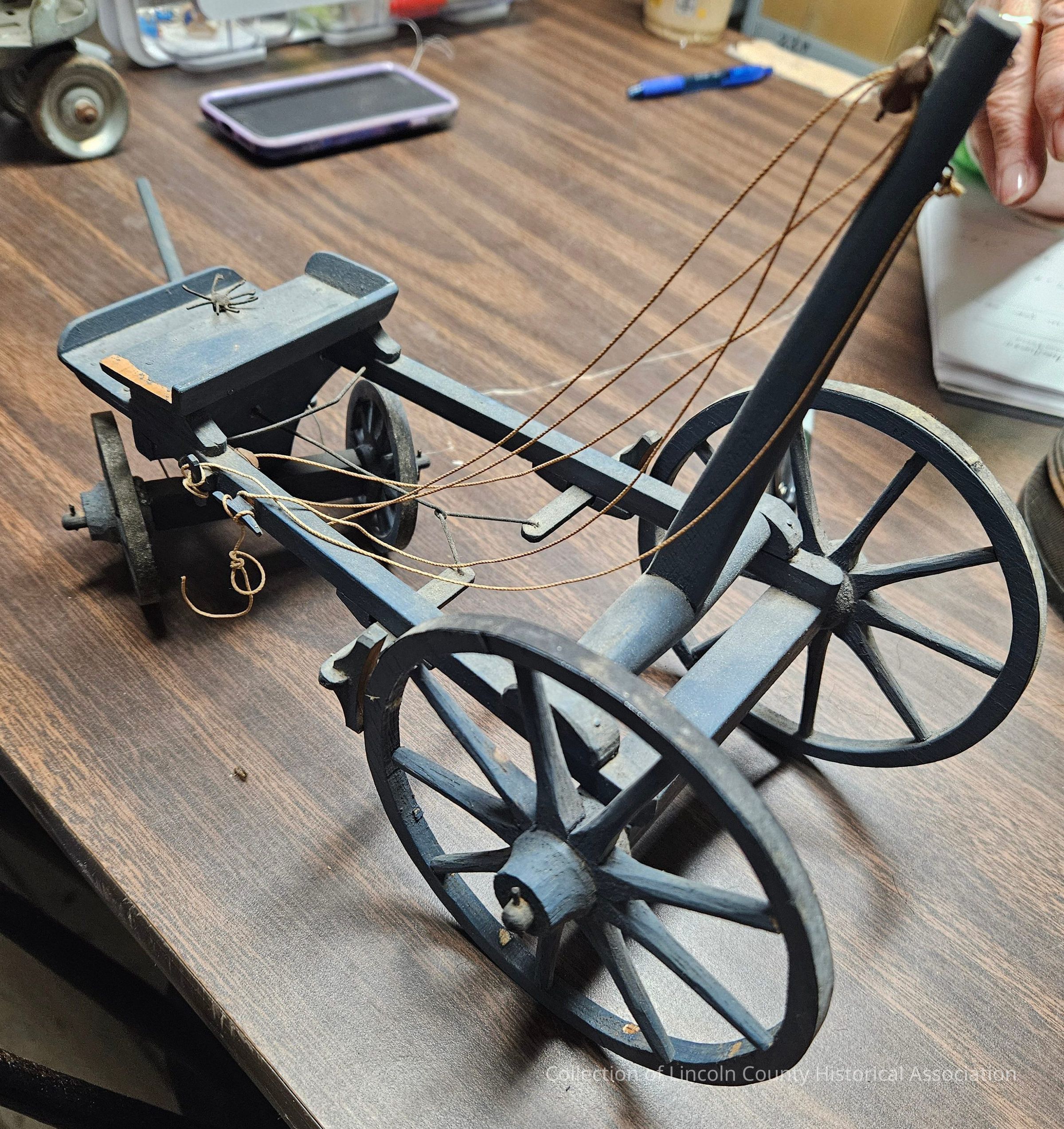 Blue wooden toy cart. Two small wheels in front and two larger ones in back. Five strands of string hanging from back of cart and tied around front. Small wooden seat at front with what looks to be a black plastic spider attached.Made/Created