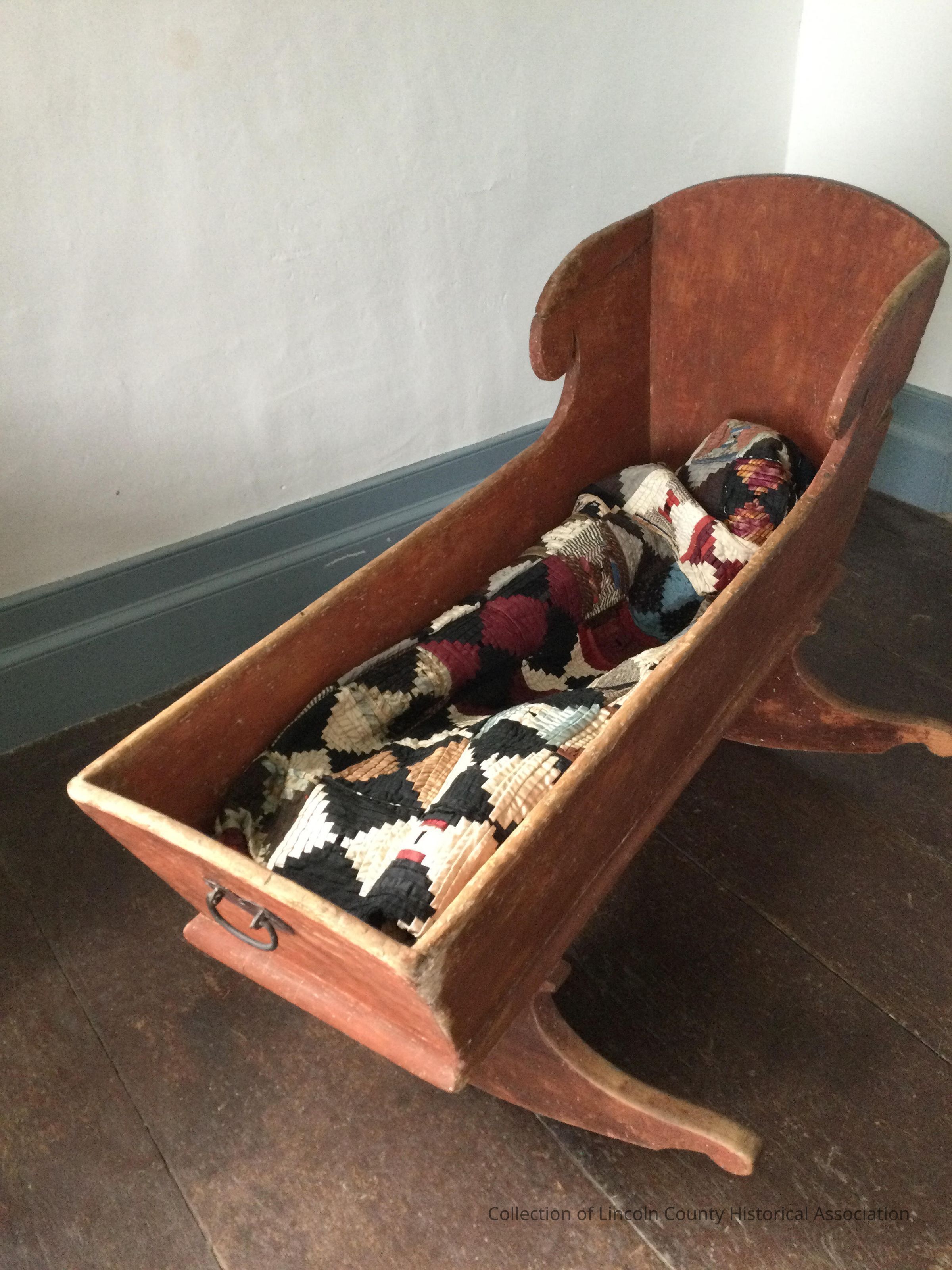 Long, narrow, uncovered cradle painted indian red. It has curved high rockers and rabbeted sides, has stretchers between rockers.Made/Created