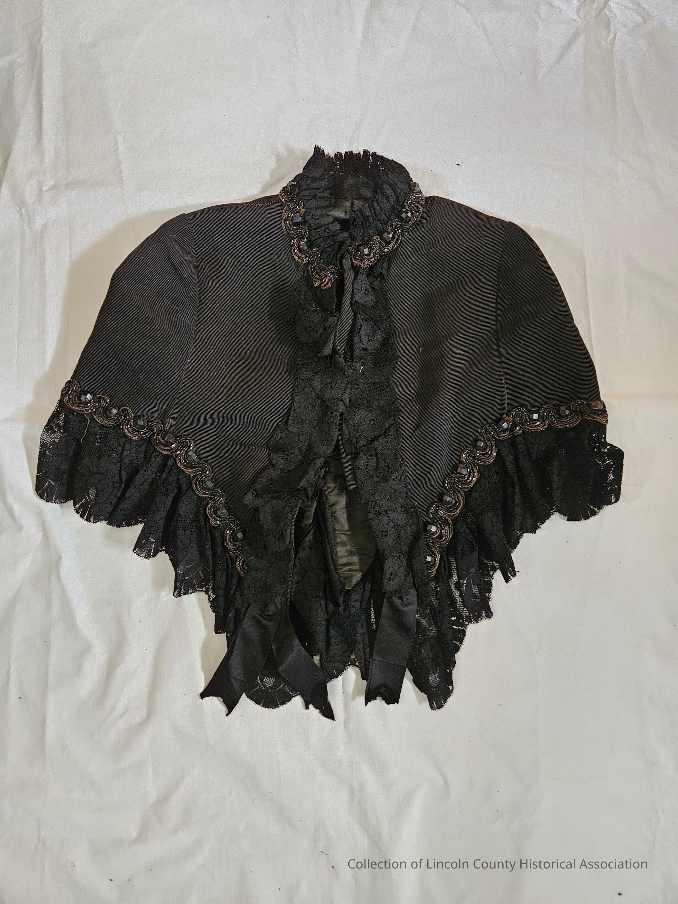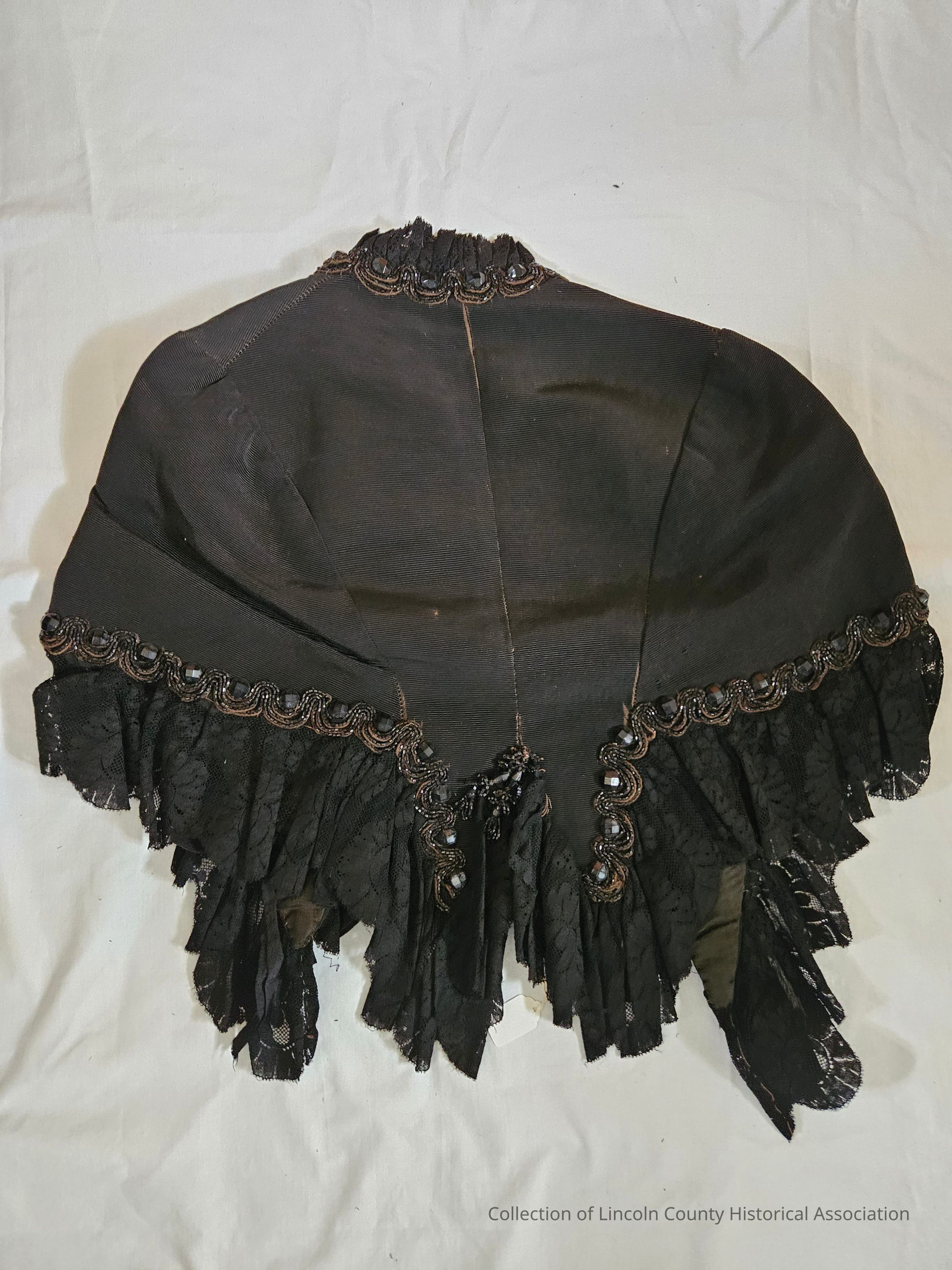 Black corded silk small cape. Heavy jet bead trim. Lace ruffles at the bottom and around collar. Lace down the middle of cape. Black ribbon tie around waist. Machine stitched.