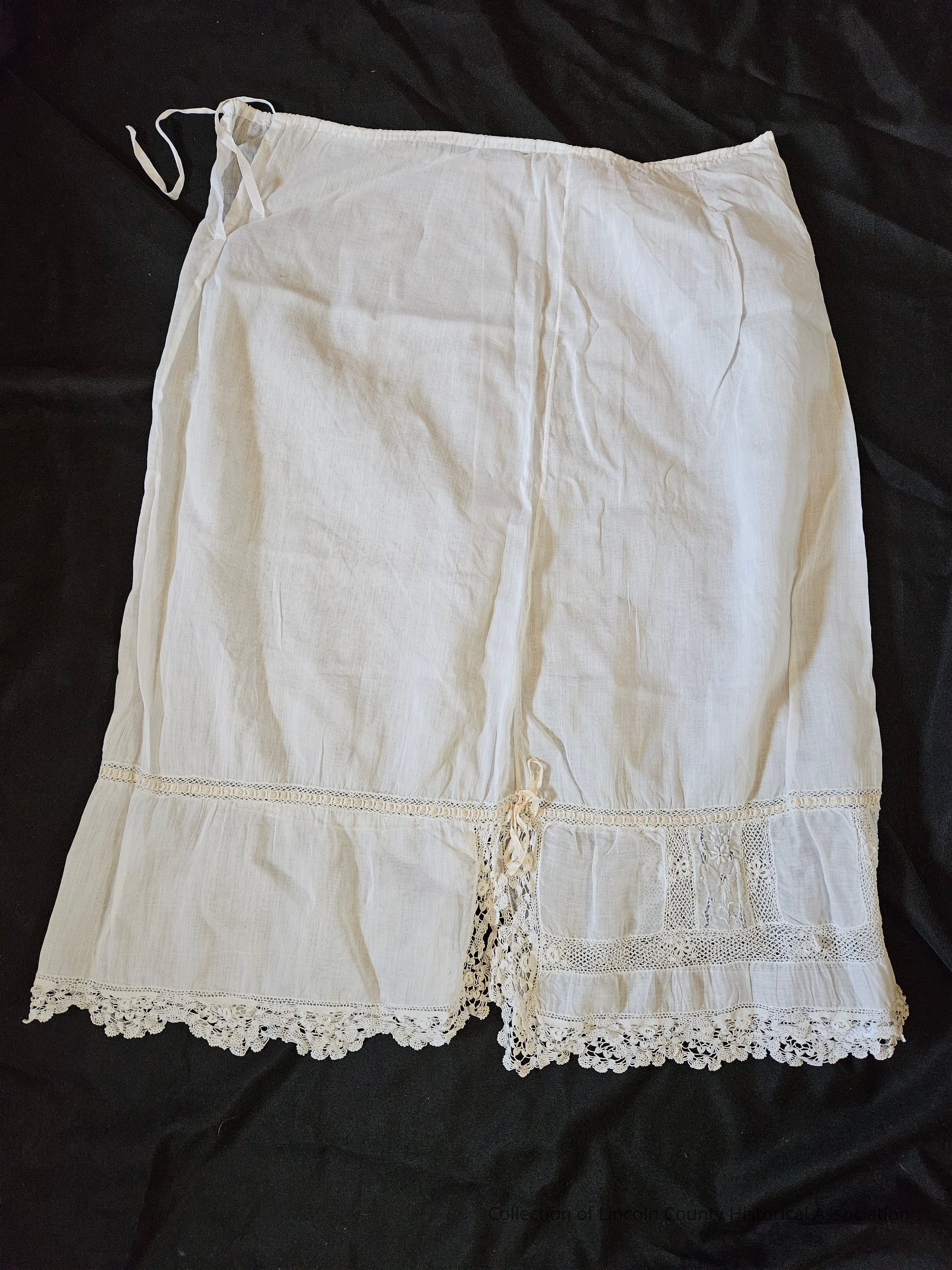 White cotton petticoat. Drawstring waist. Strips of inserted lace at the bottom. Also floral embroidery at the bottom and pink ribbon. Lace edging. Split in middle at bottom sidesClothing/Dress/Costume Details