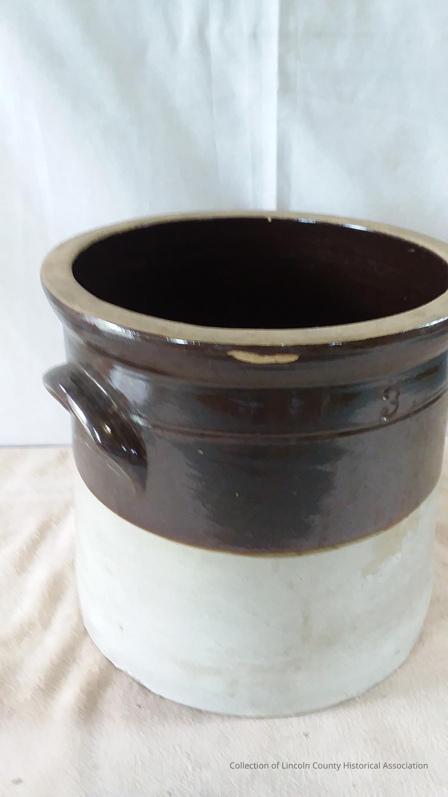 Stoneware crock with two eared handles. Three gallon capacity. Cylindrical and slightly flared. Dark brown slip glaze inside and half way down the exterior sides. Glaze shifts to off-white at the bottom.Made/Created