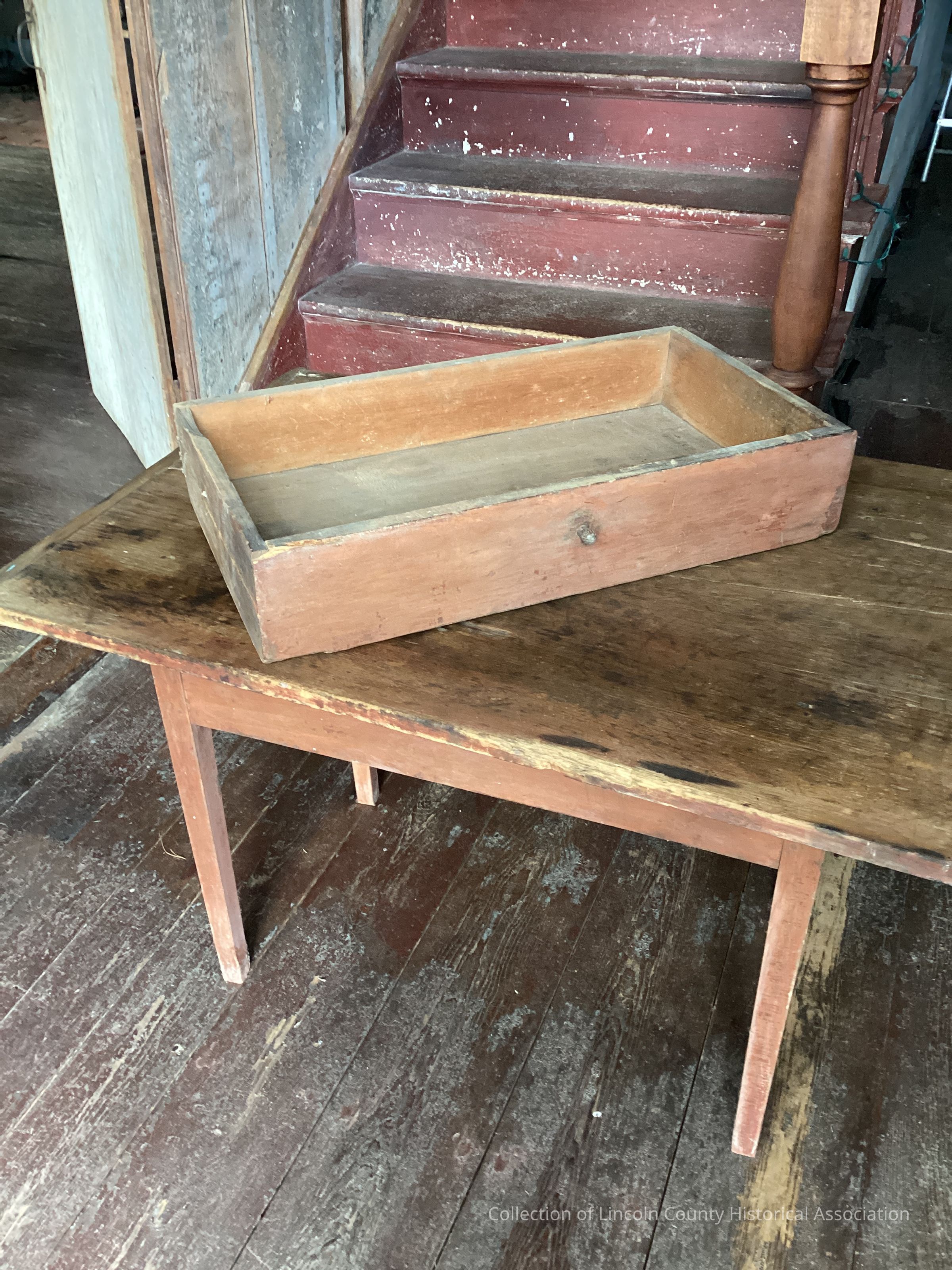 Country tavern table with single board top with bread board ends. Ends are nailed into board top. Plain straight legs. Table has a drawer (nailed together)Made/Created