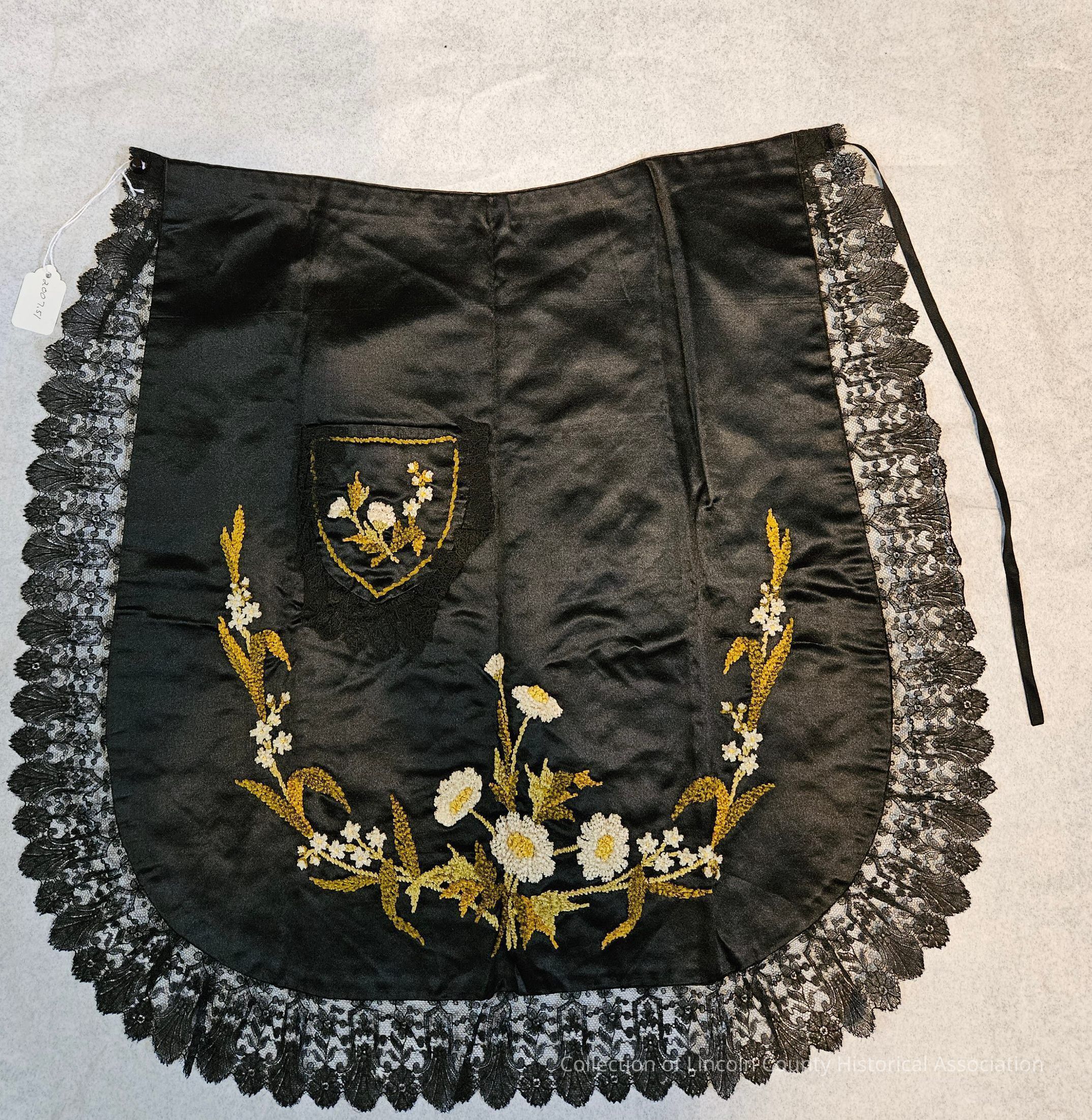 Black satin apron with floral lace edging. Chenille floral embroidery on front. One small pocket. Small ribbon tie at waist, as well as one button. Hand stitched.Clothing/Dress/Costume Details