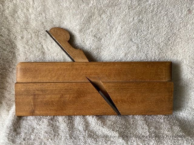 Wood and iron rounding plane. Design modified around a round plane and tapers slightly to the left. Guides are missing.