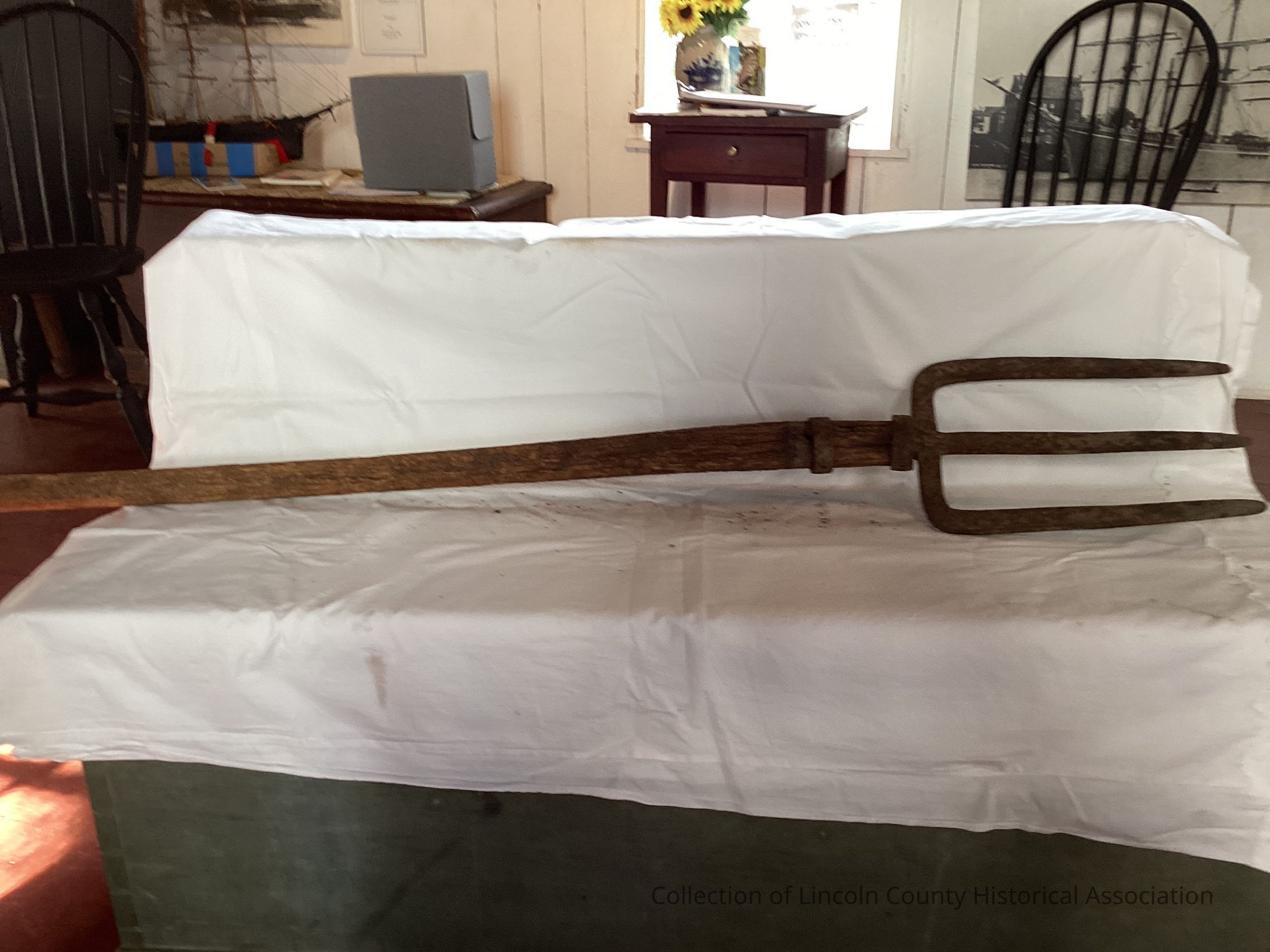 Fork is heavy hand-forged iron with three tines. Wooden handle with two metal rings at place where handle and fork attached. Hand-made wooden handle extends on one side over end of metal fork where fork is attached to handle.