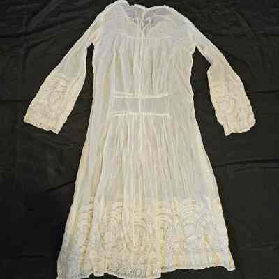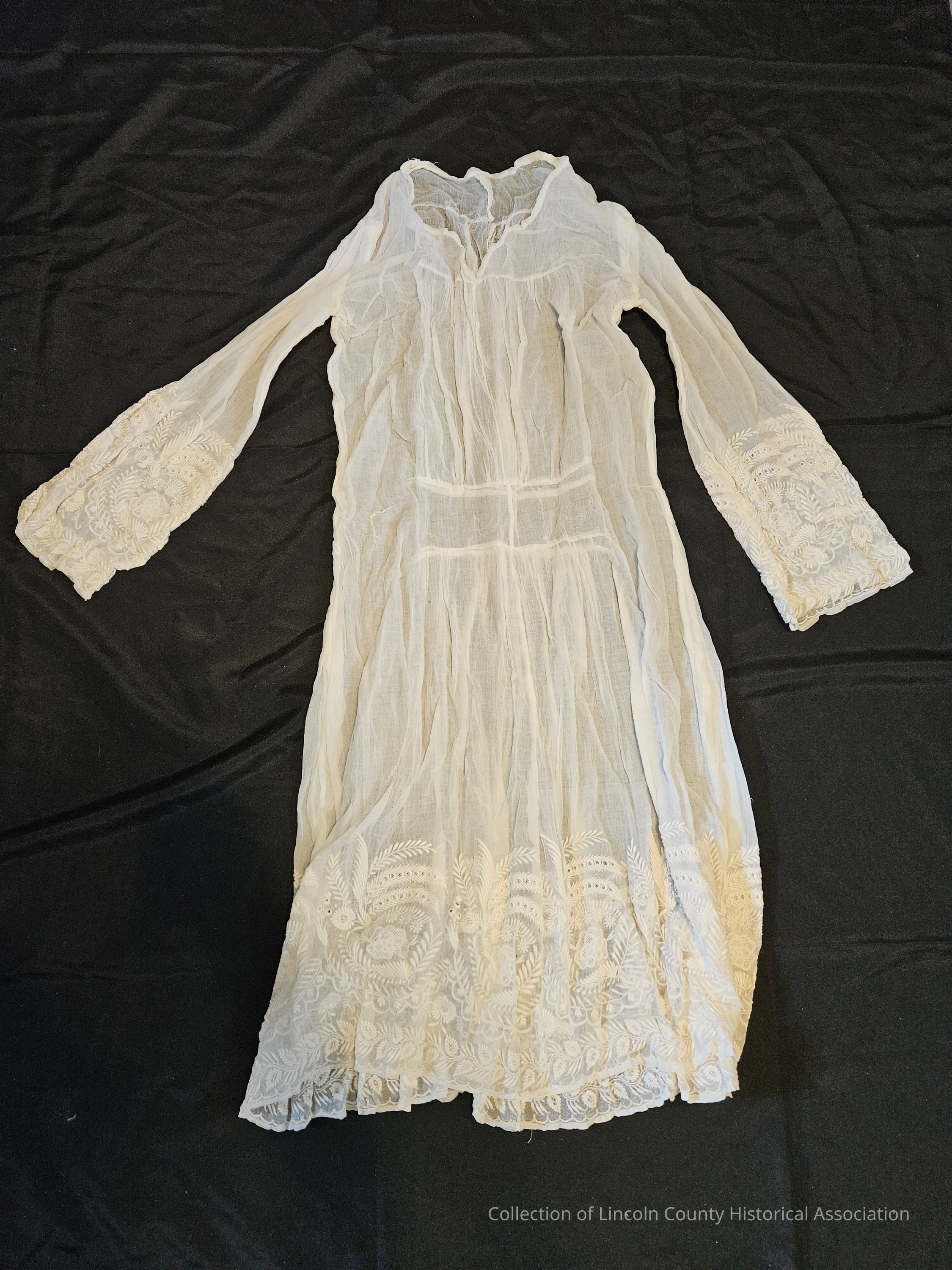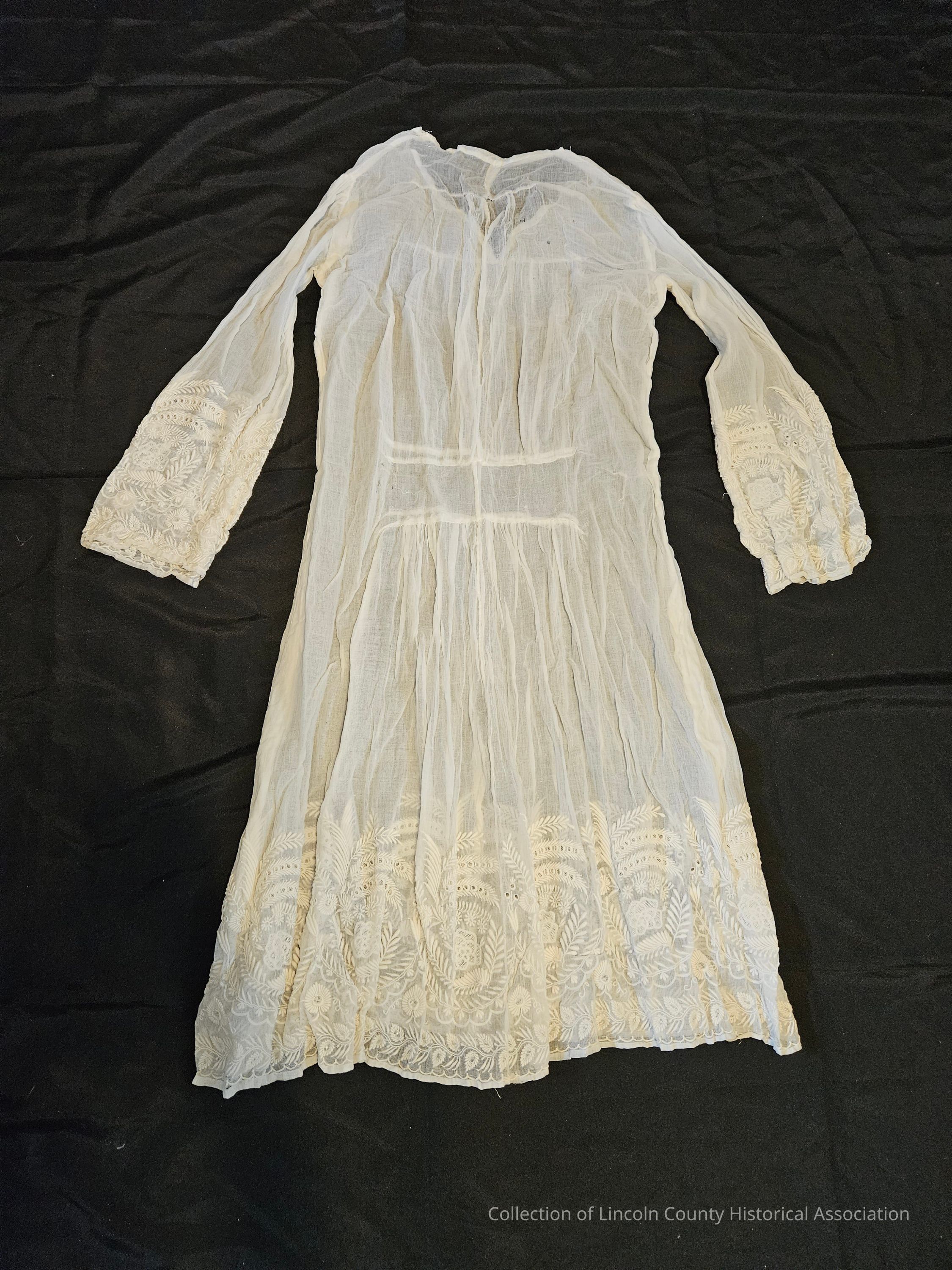 White cotton gauze overdress. Floral embroidery at sleeves and hemline. "V" Shaped slit at collar. Machine made.Clothing/Dress/Costume Details