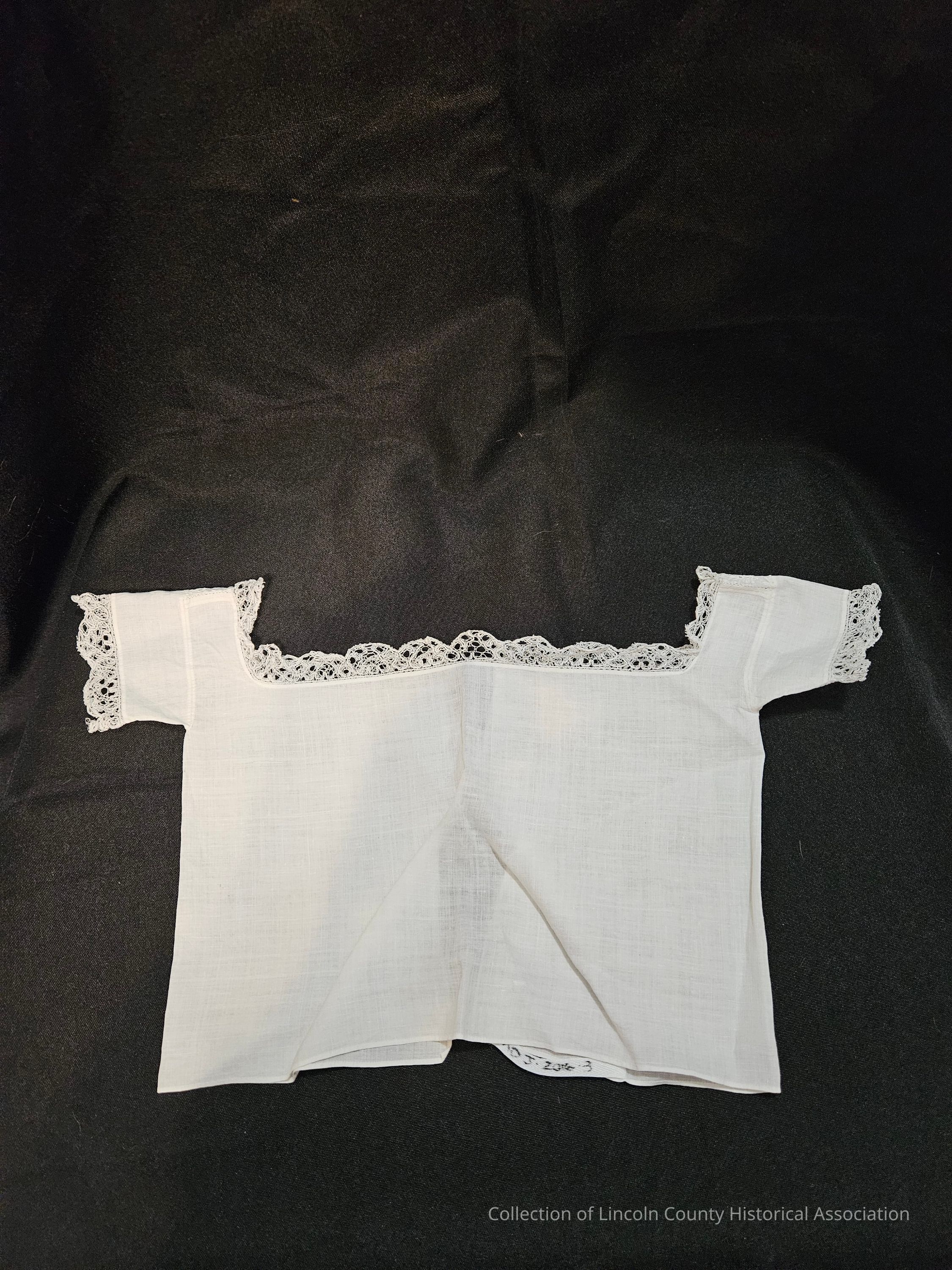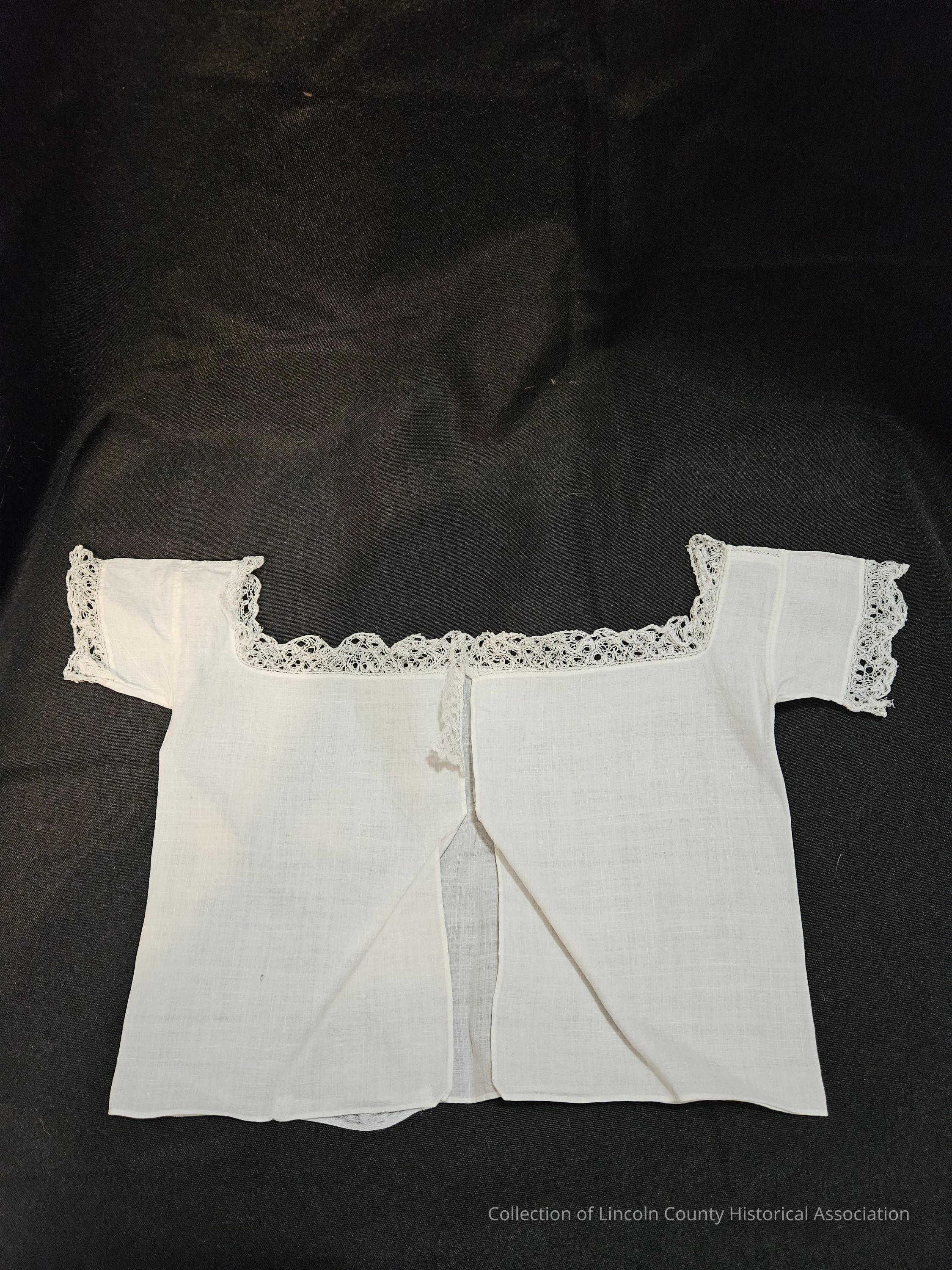 White cotton infant shirt. Lace edging around arms and front and back of neck. Small embroidered design on top of shoulder. Back is not sewn together.Clothing/Dress/Costume Details