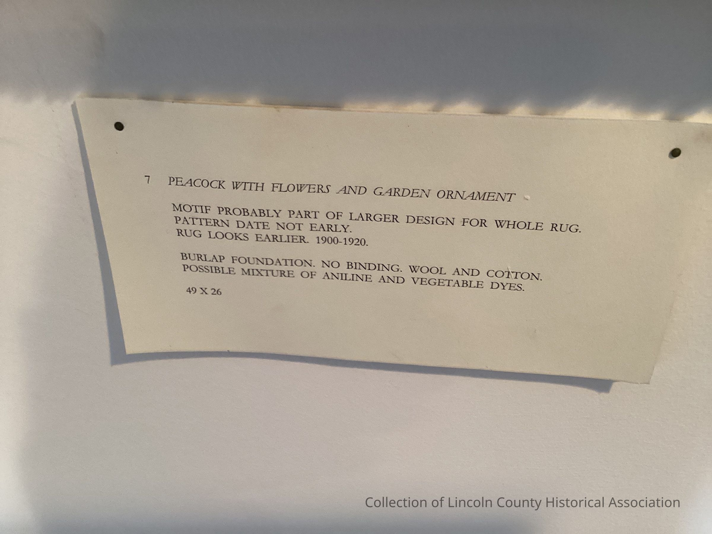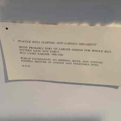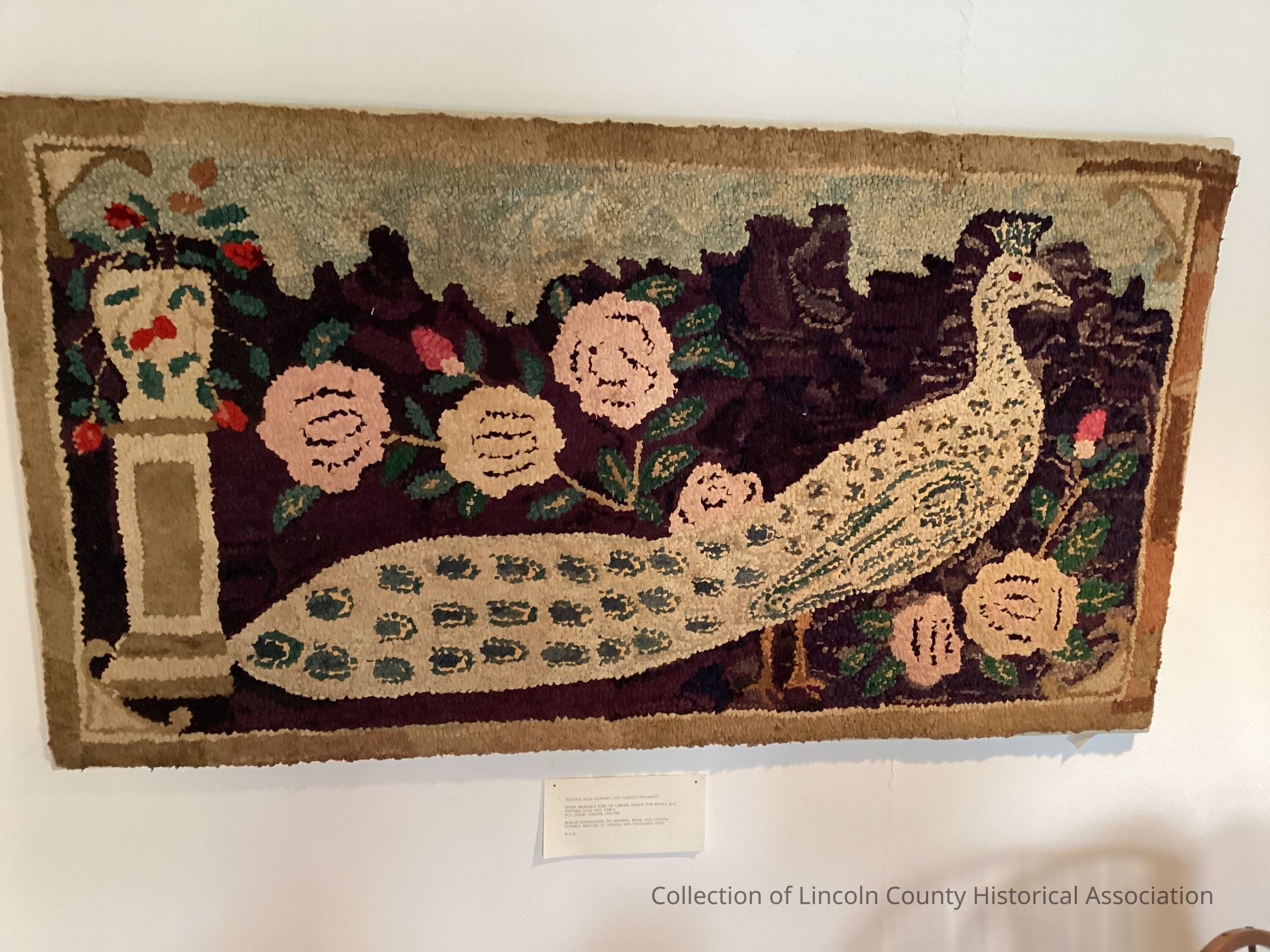 Rectangular hooked rug with image of peacock and flowers. Also urn on stand. Peacock a tan and green color, background brown, and flowers pale pink. Burlap foundation, no binding. Wool and cotton yarn. Possible mixture of aniline and vegetable dyes.Made/Created