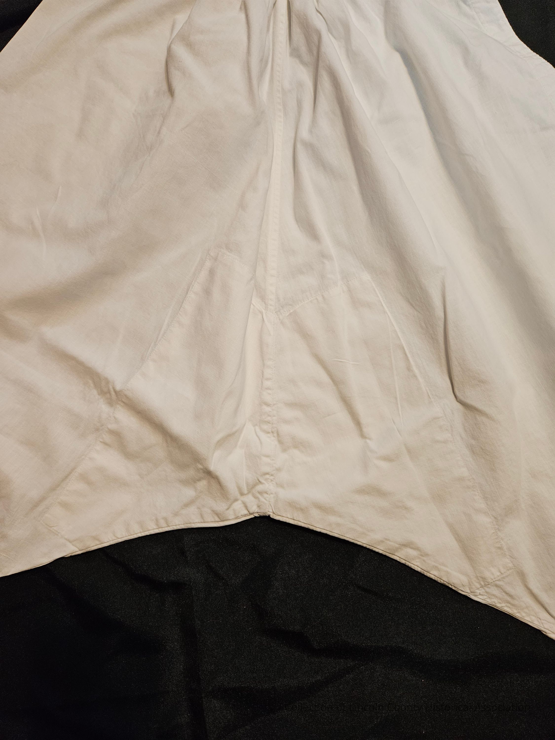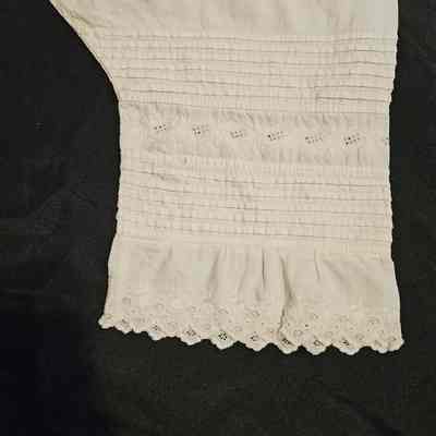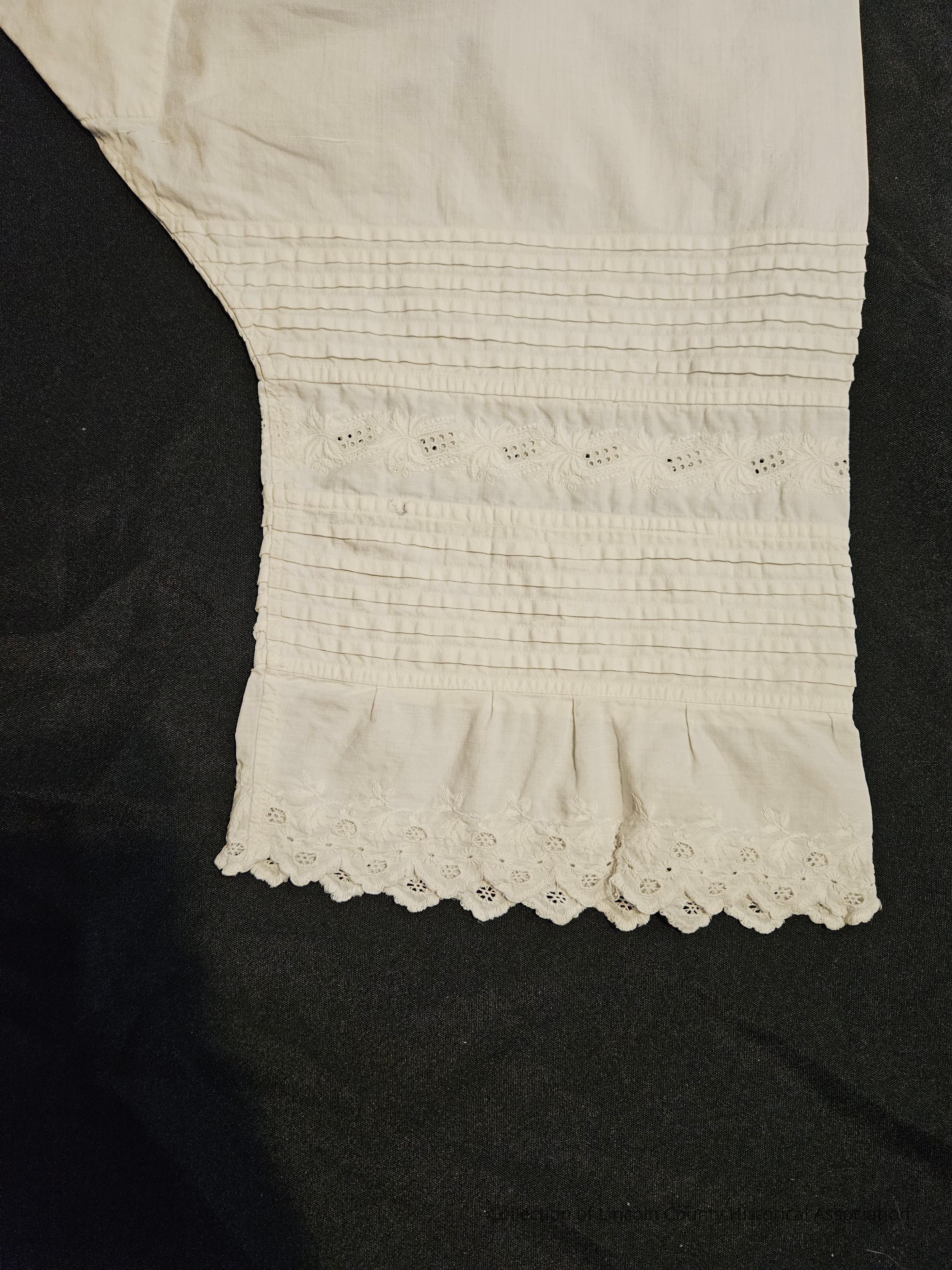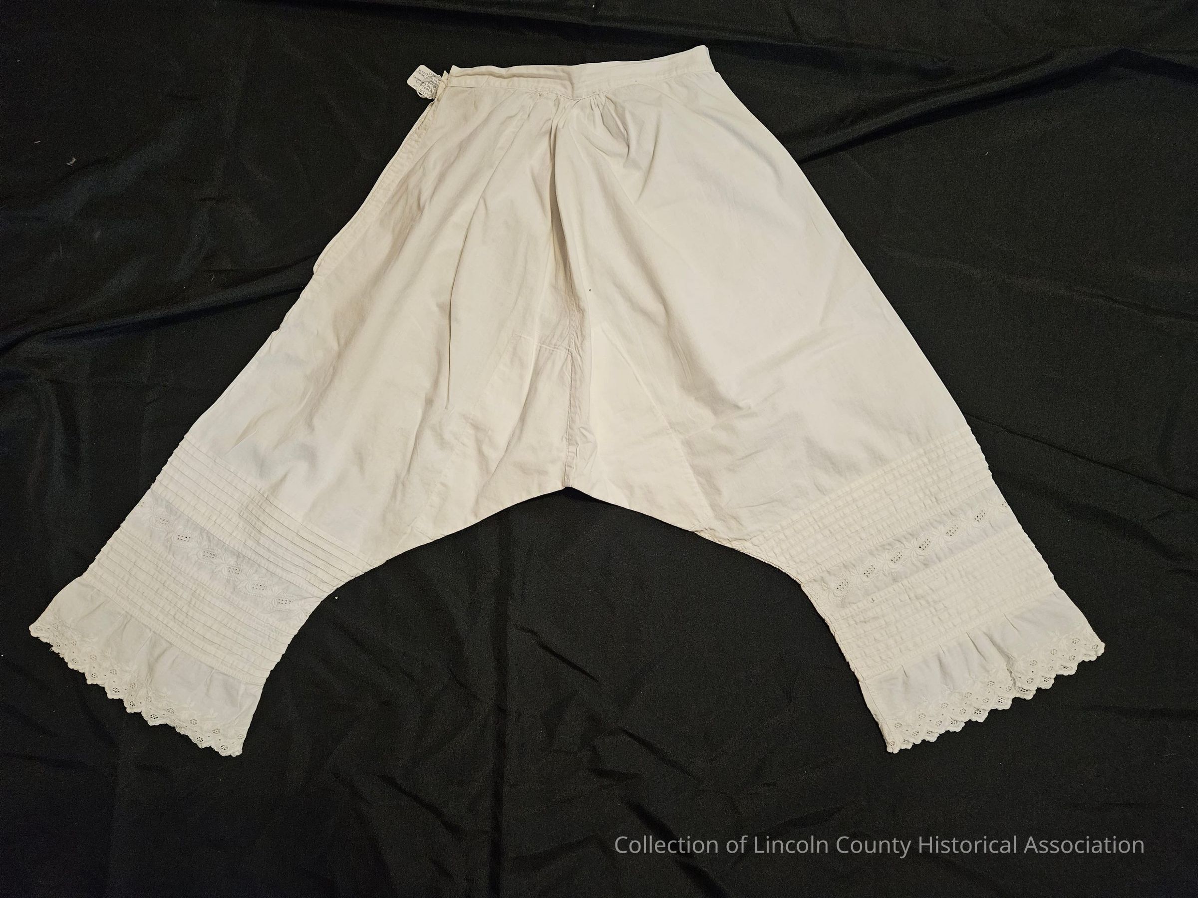 Women's white cotton underpants/drawers. Reinforced crotch. All machine stitched. Pleats and machine made embroidery at the bottom of pant legs. Embroidery is leaf designs. Single button on side of waist.Clothing/Dress/Costume Details