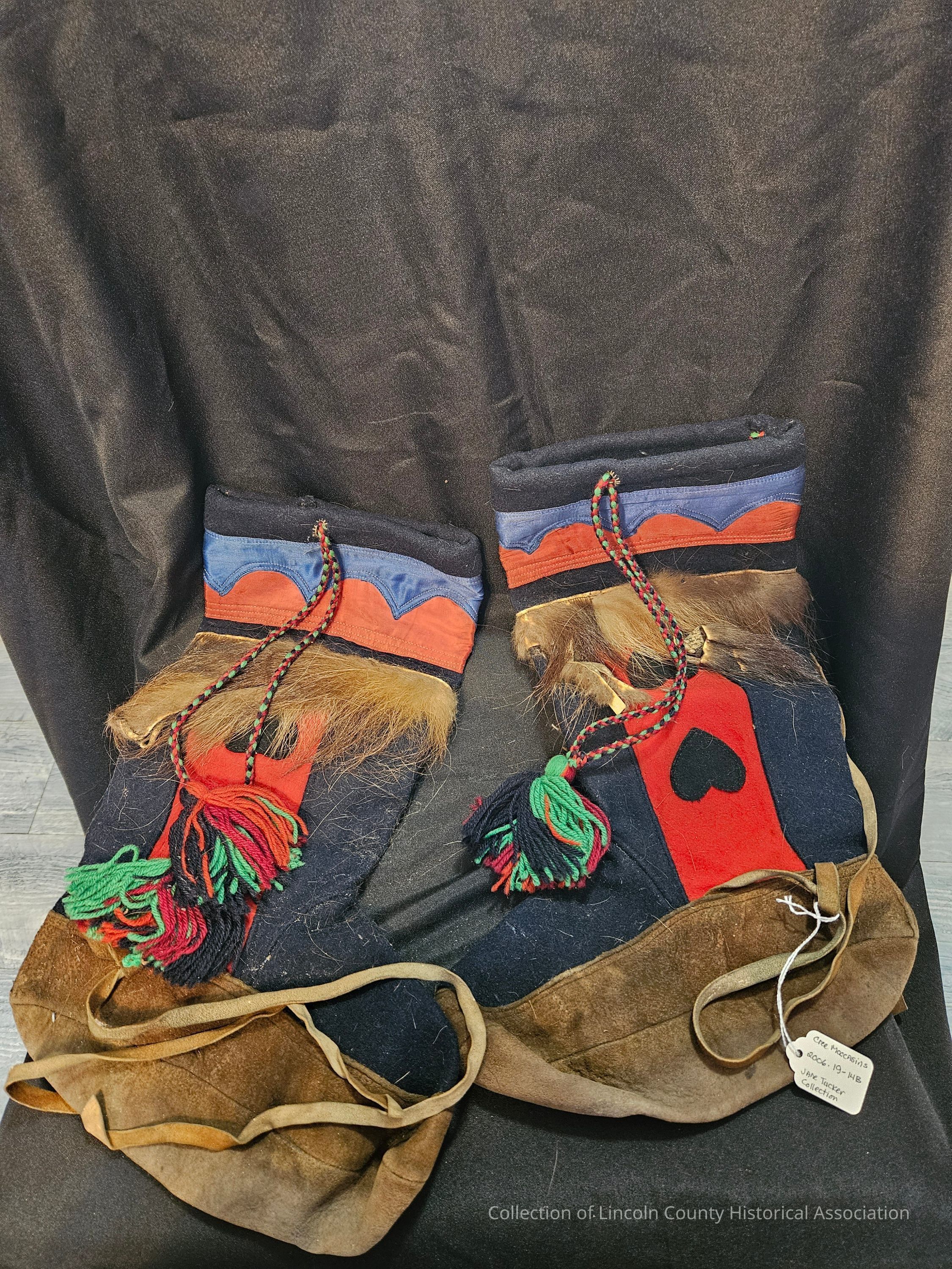 Pair of blue and red wool Cree moccasins. Braided tassels on each shoe. Moose hide bottoms and wolverine fur on top. Two blue heart designs on sides.