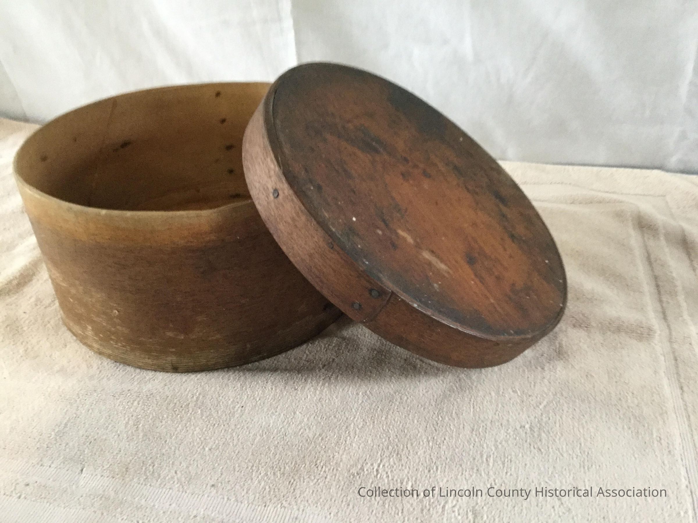 Small round, natural color wood pantry box with lid. Sides on box bottom and lid are both lappedMade/Created