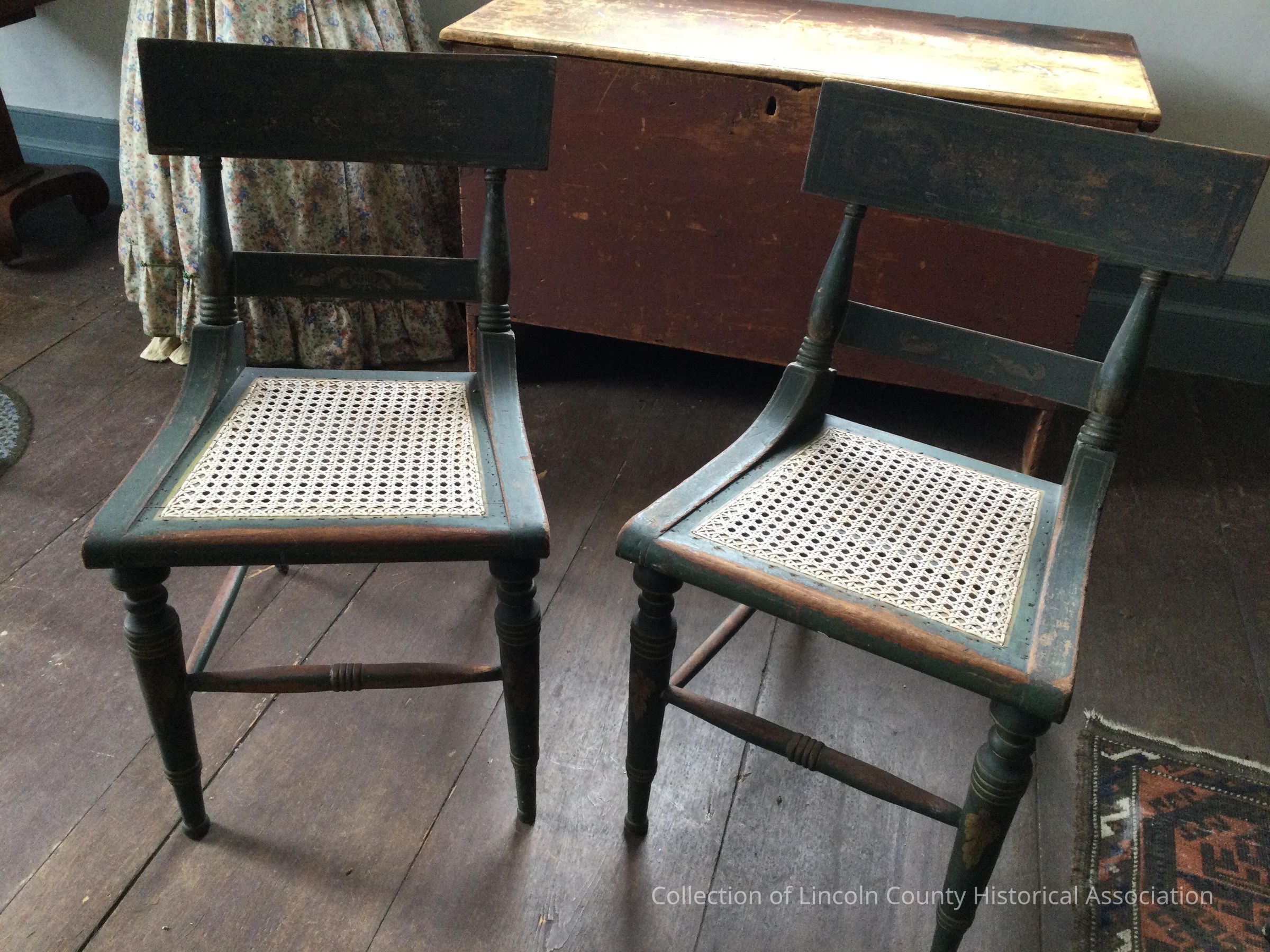 2 Hitchcock chairs painted green and gold. Paint is peeling. Chairs have tapering, turned legs and stretchers. They are single splat with wide crest rail and cane seats. These are "Baltimore" fancy chairs with Klismos backs. the front legs, back legs are turned and legs have a rolling pin taper.Made/Created