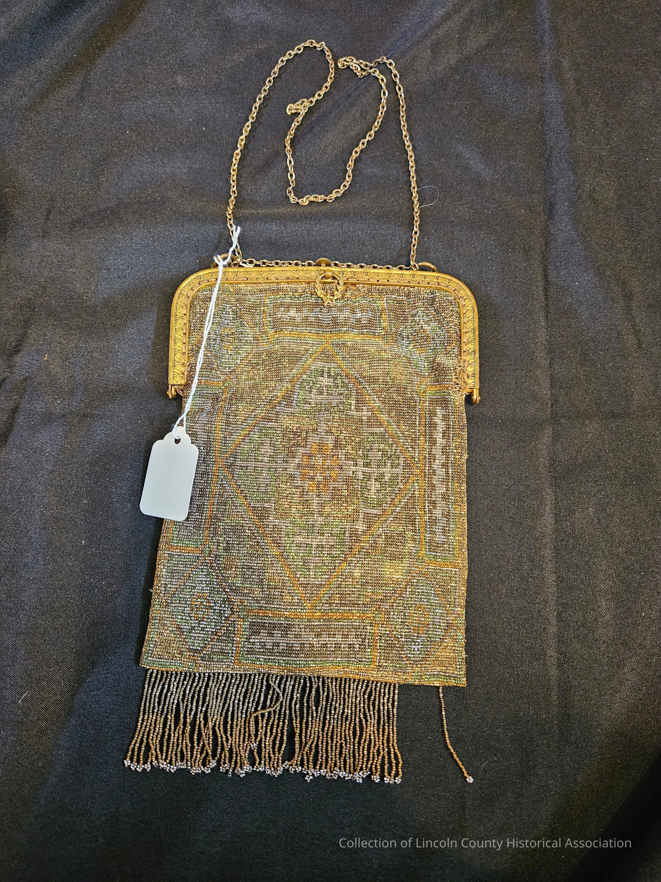 Green, orange and silver beaded purse. Geometric design. Gold and silver beaded fringe. Gold clasp closure with push button. Gold circle with leaves hanging from clasp. Gold chain. Pink satin lining with one interior pocket. Small mirror inside purse.Made/Created