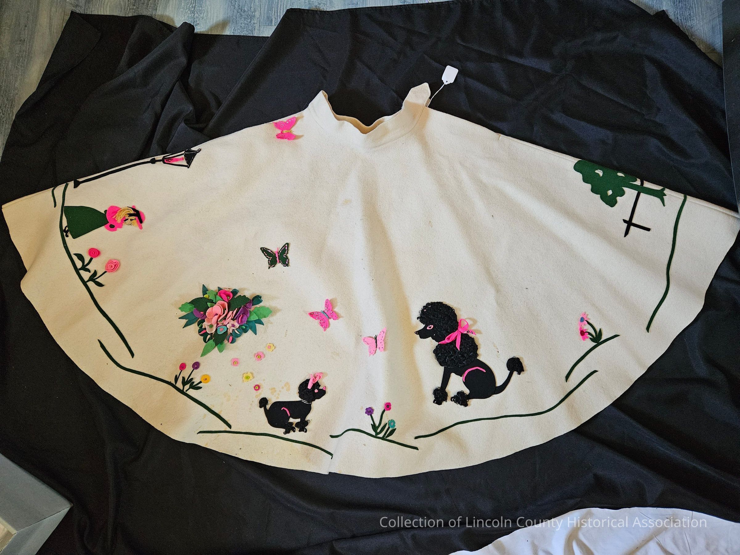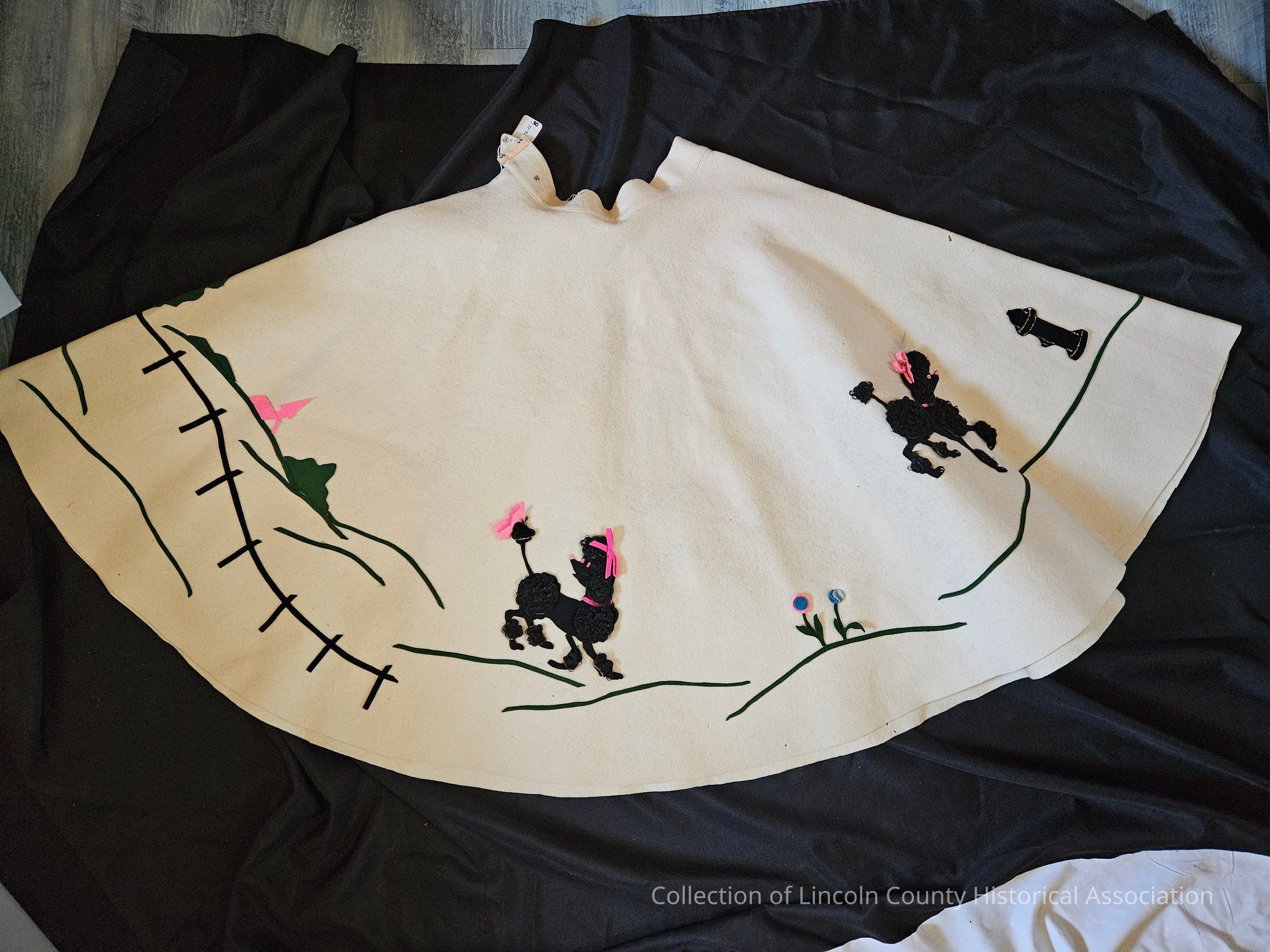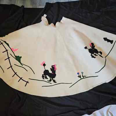 White wool poodle skirt with felted designs of trees, lampposts, butterflies, flowers, black poodles, fire hydrant, and a woman. Hook closure at waist and two pockets at waist.Clothing/Dress/Costume Details