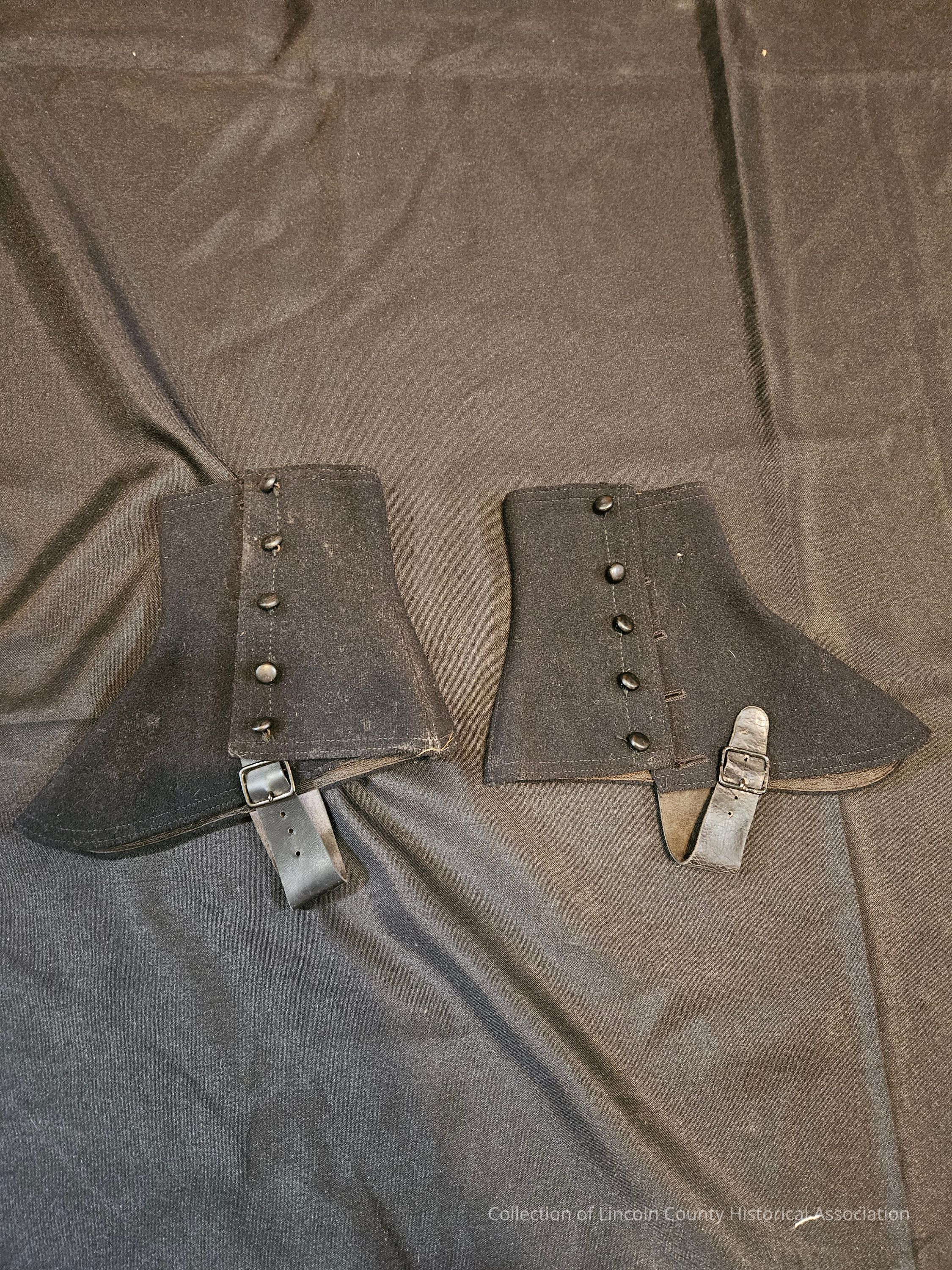 Pair of black wool men's spats. Five black buttons on each spat. Black leather strap and buckle on bottom of each spat.Clothing/Dress/Costume Details