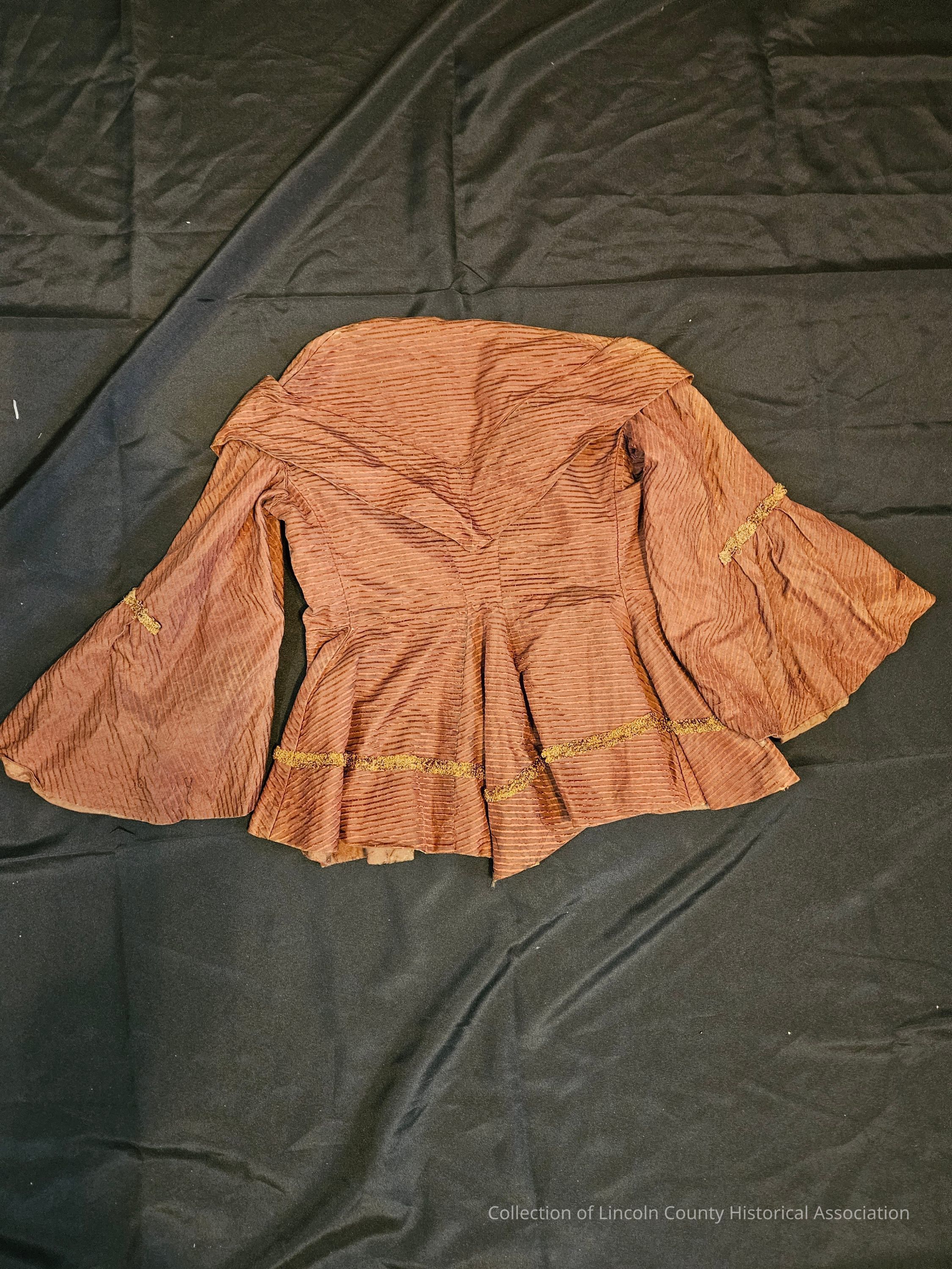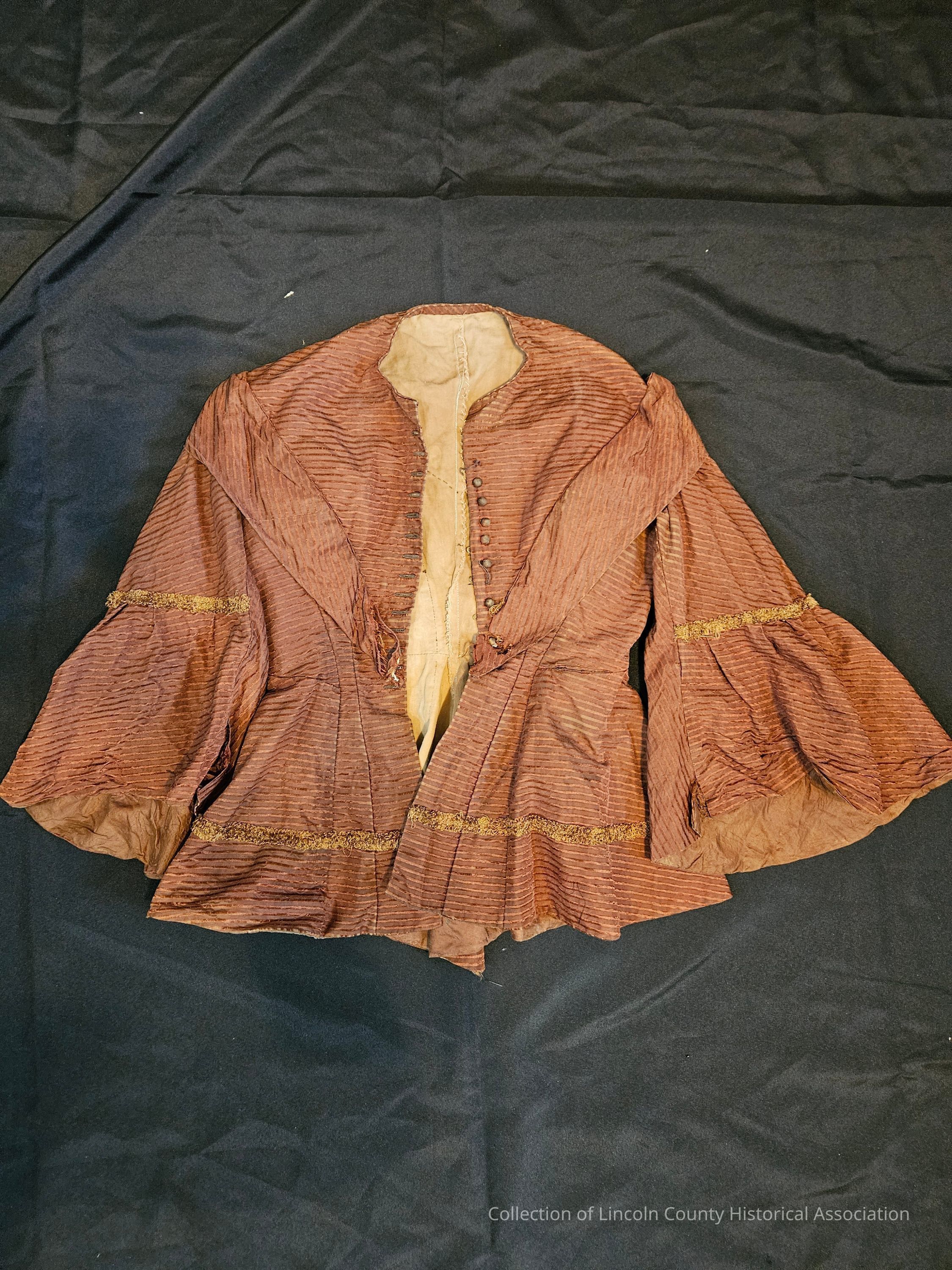 Brown striped cotton bodice. Gold frayed string stipes around sleeve and waist. Sewn on shawl like portion over shoulders, ending in a "V" shape in the front and back. Ends of "V" button together in front. Fourteen button holes along front, seven extant fabric covered buttons. Metal clasps as well underneath the buttons on the inside. One small pocket on front. Lining on back and stomach is a thick canvas like lining. Soft brown cotton lining on the sleeves. Partly hand stitched and partly machine stitched.
