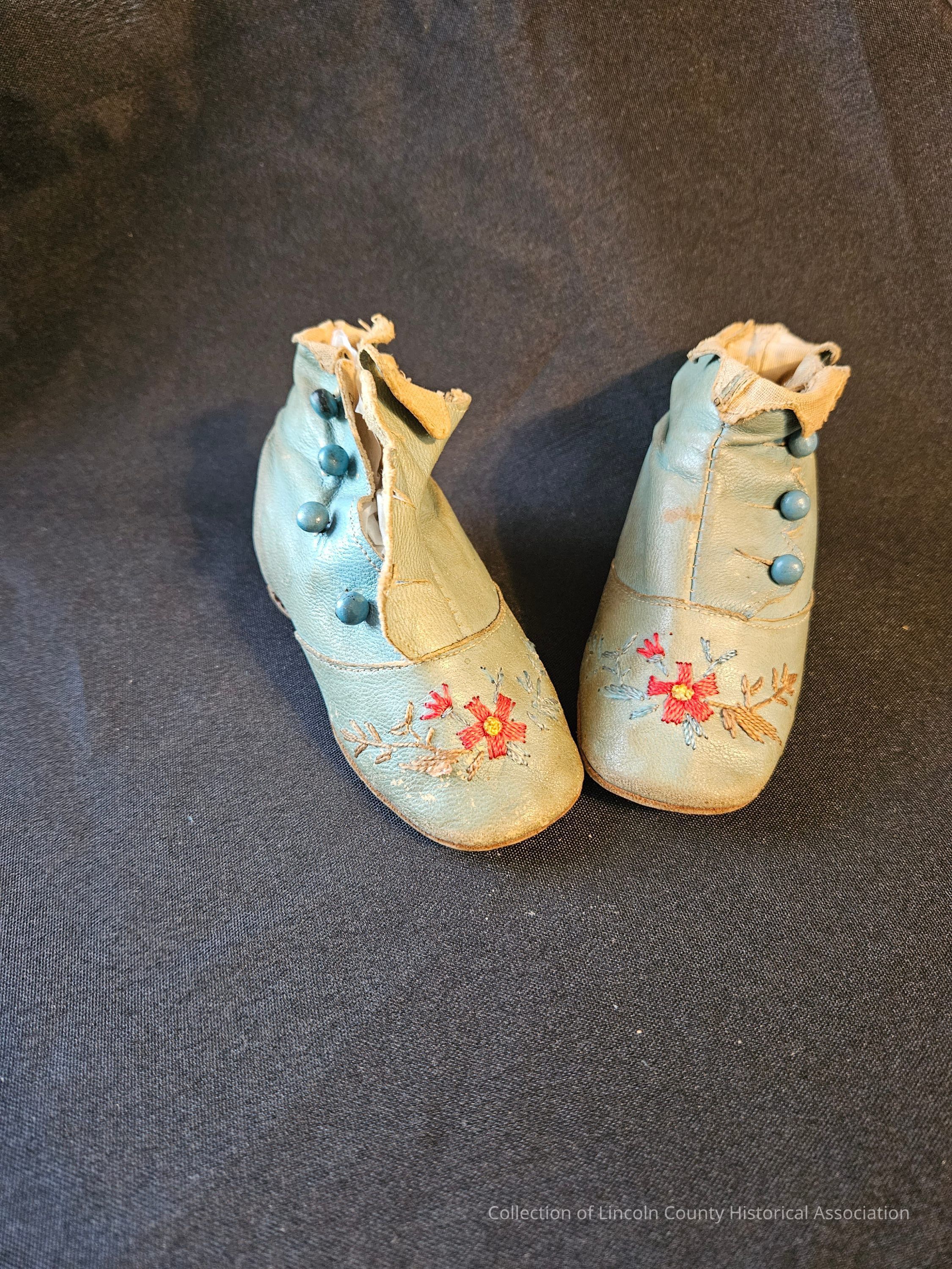 Pair of blue leather shoes. Embroidered with red, blue, and brown flower design on front. Four blue buttons on sides, scalloped edging. "3" impressed on soles of both shoes.