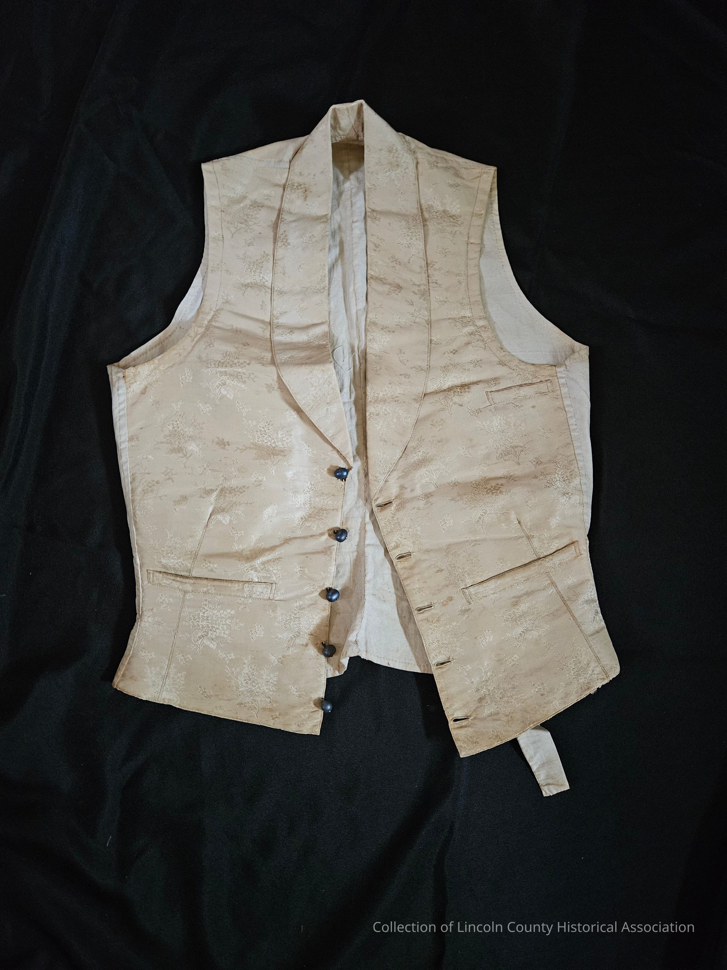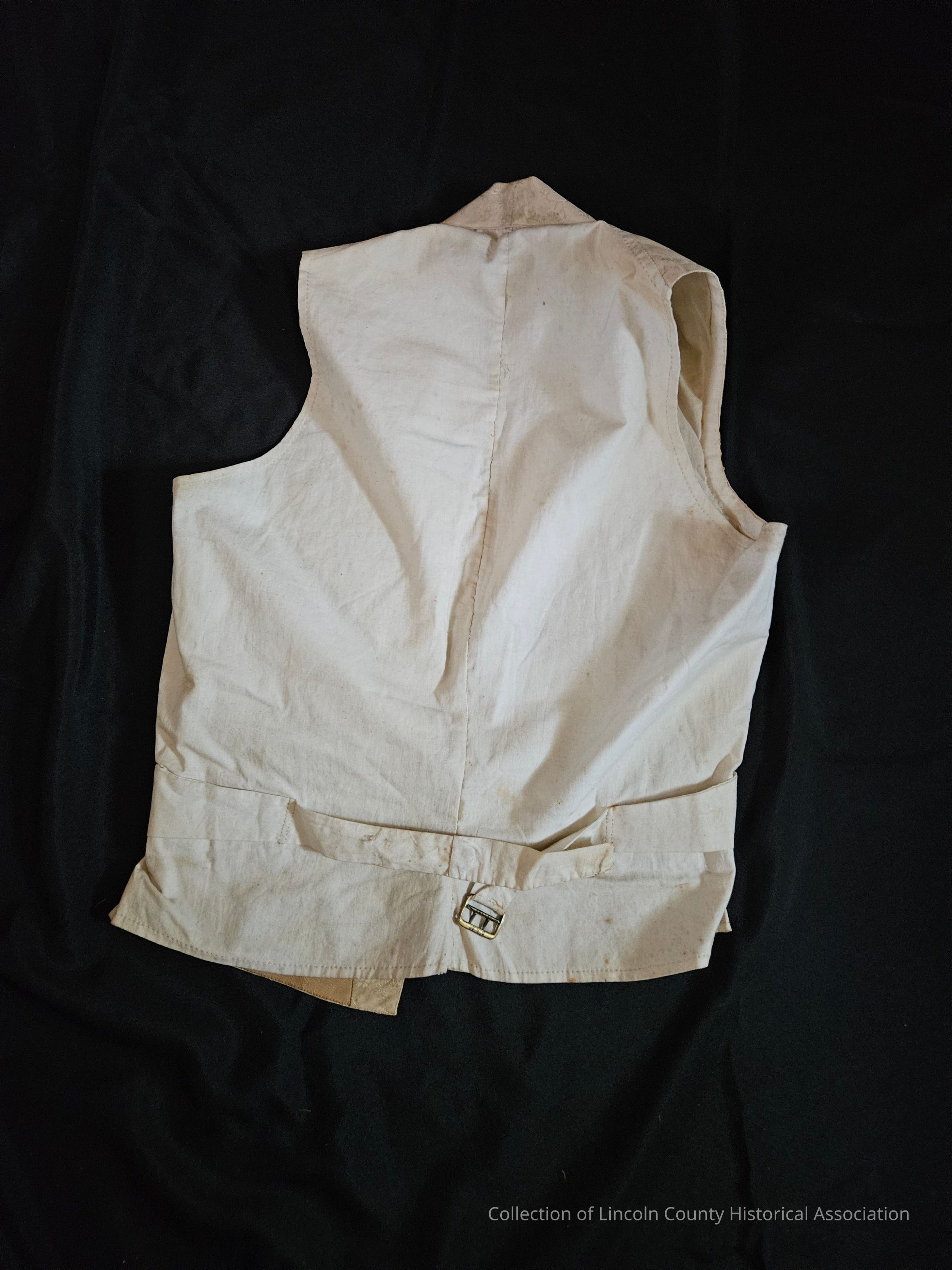 Men's white dress vest. Silk embroidered front with floral pattern. Plain white cotton back. One breast pocket and two pockets at waist. Five blue buttons and folded collar in the front. Buckle strap in the back at waist. Machine stitching.Clothing/Dress/Costume Details