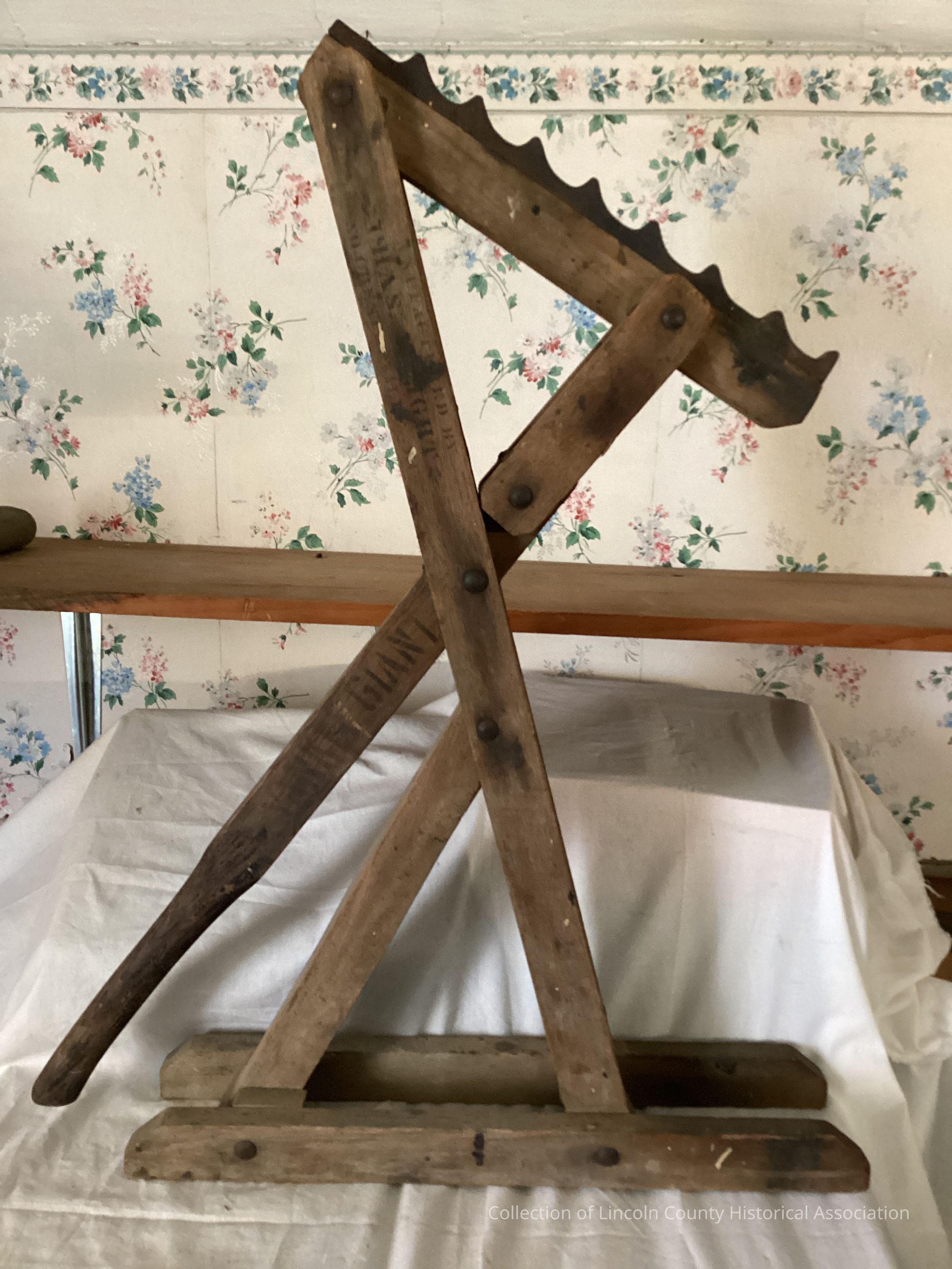 Wood with ratcheted cast iron grip. Heavy metal rods set through the wooden components.