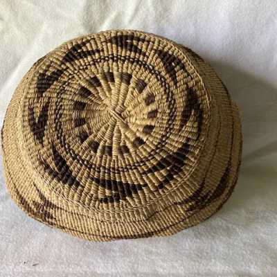 Bowl-shaped basket with a flattened base. Made of vegetable fiber. Geometric decoration comprised of two shades of brown. Interior unfinishedMade/Created