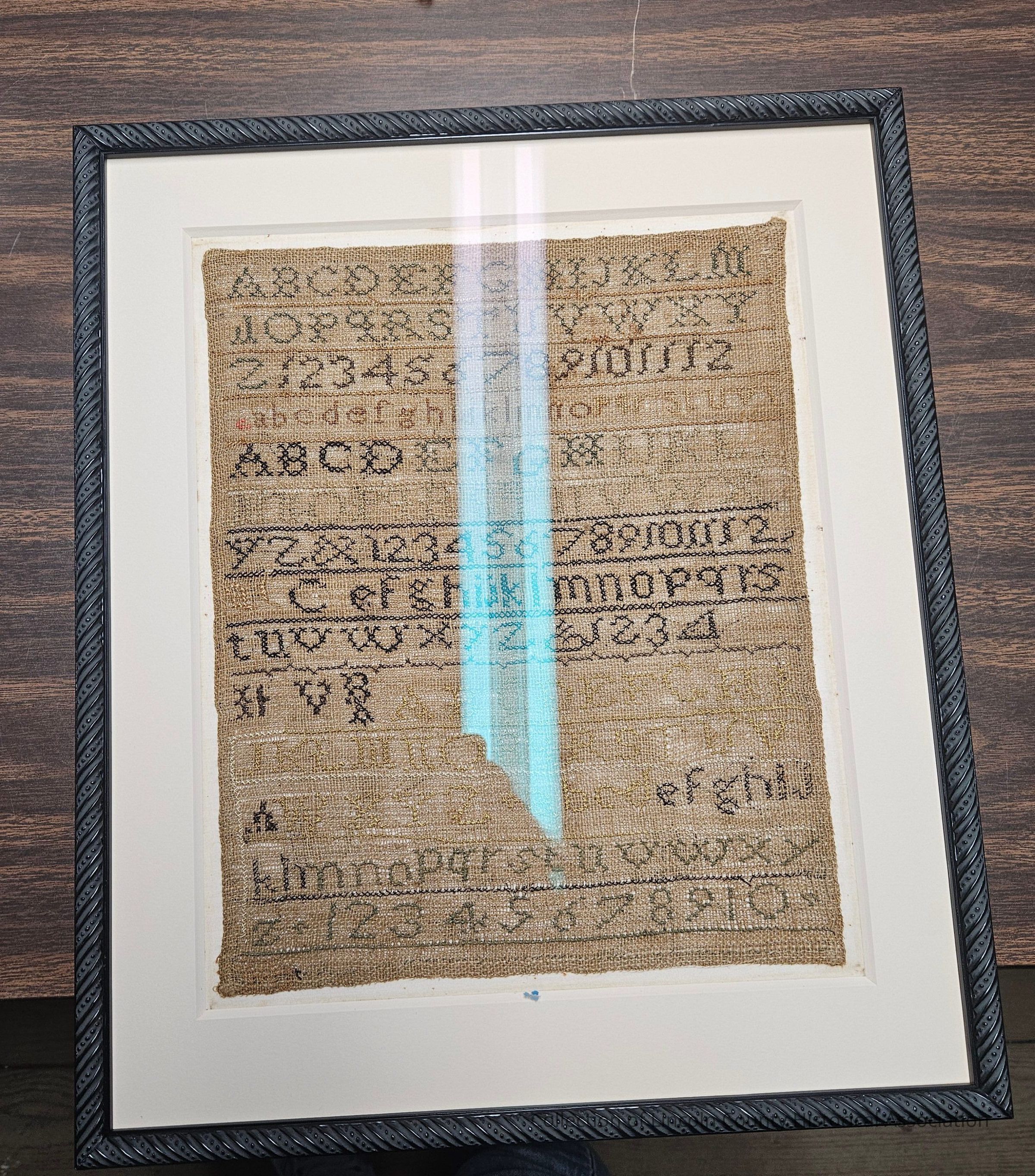 Simple anonymous sampler. Black and brown silk thread on homespun linen background. Embroidered with rows of letters and numbers.Made/Created