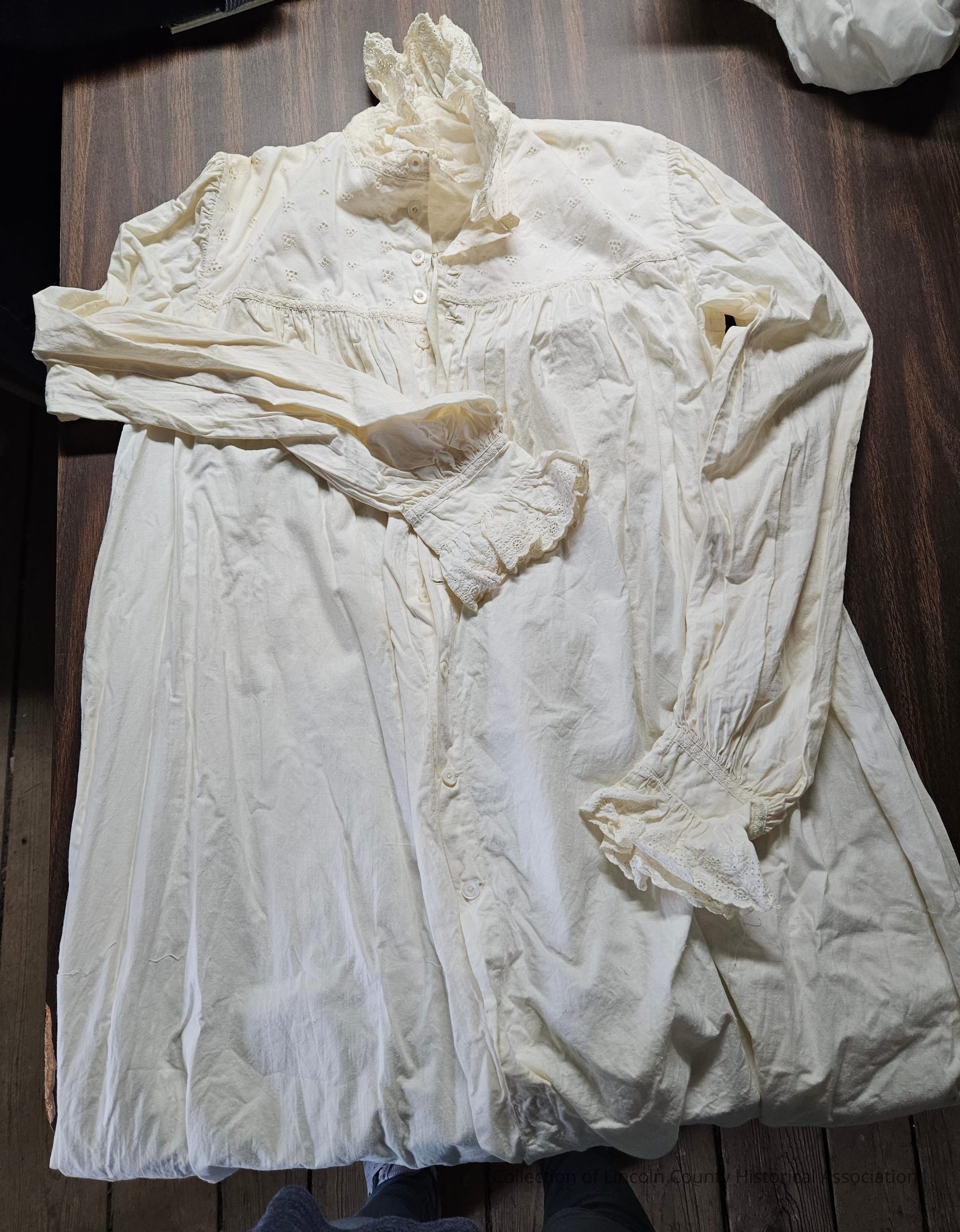 White cotton nightgown. Ruffled at sleeves and neck. Buttons down the front. Circle embroidery at chest.Clothing/Dress/Costume Details