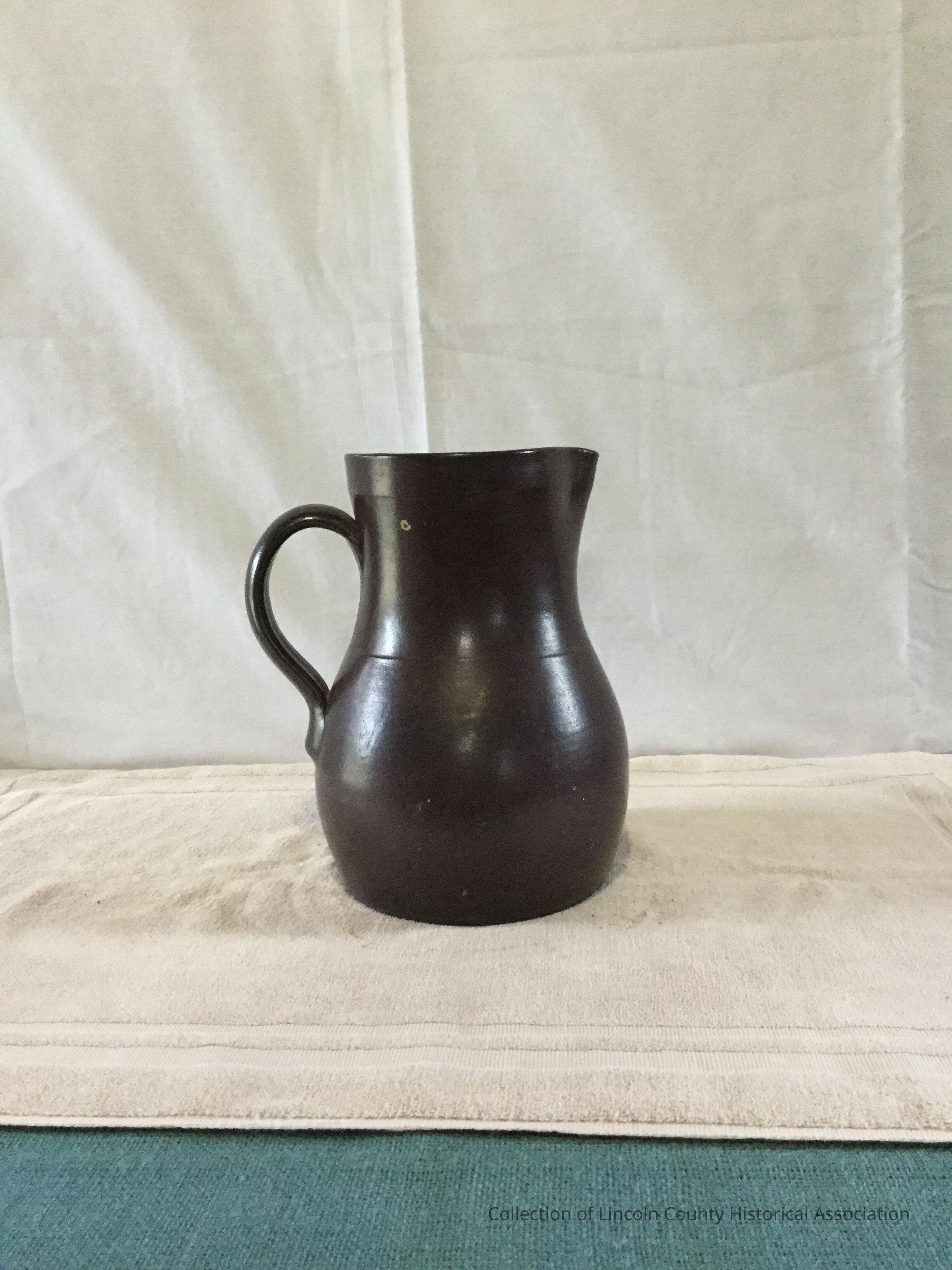 Bulbous, round earthenware pitcher with a dark brown slip glaze inside and out. Single looped handle. With an incised line around the collarMade/Created
