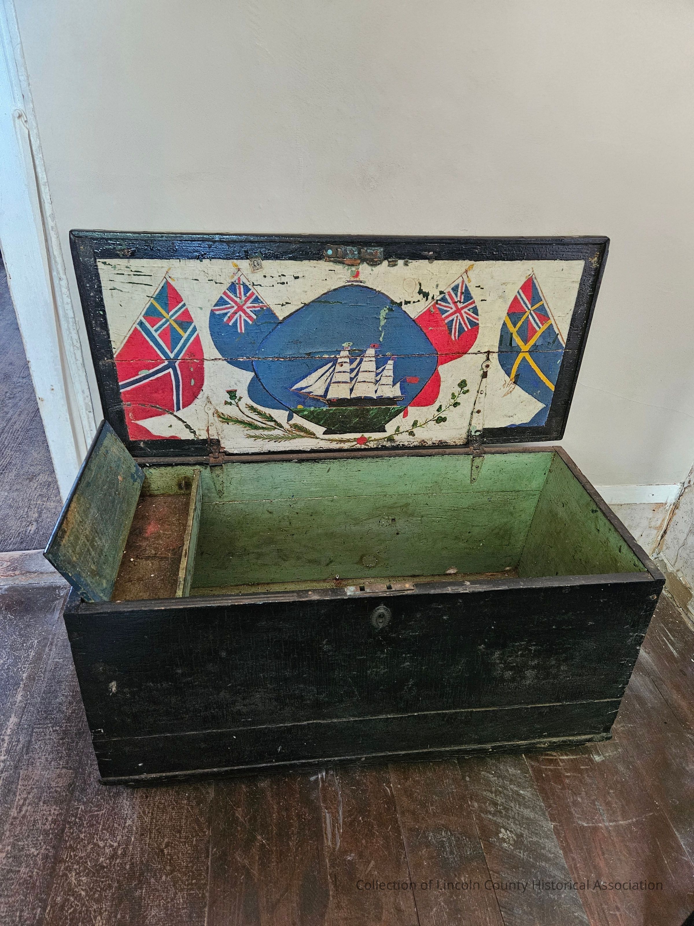 Six board pine sea chest. Exterior painted black. With rope handles at either end (beckets). Interior of lid painted with a sailing ship and with British flags. Rest of interior painted green. Retains complete till with its lid. Original wrought iron hingesMade/Created