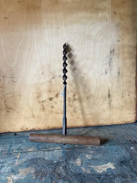 Spiral steel auger with a hand carved cross wooden handle with iron clinched into it. Shear steel number 4. With seven spirals.