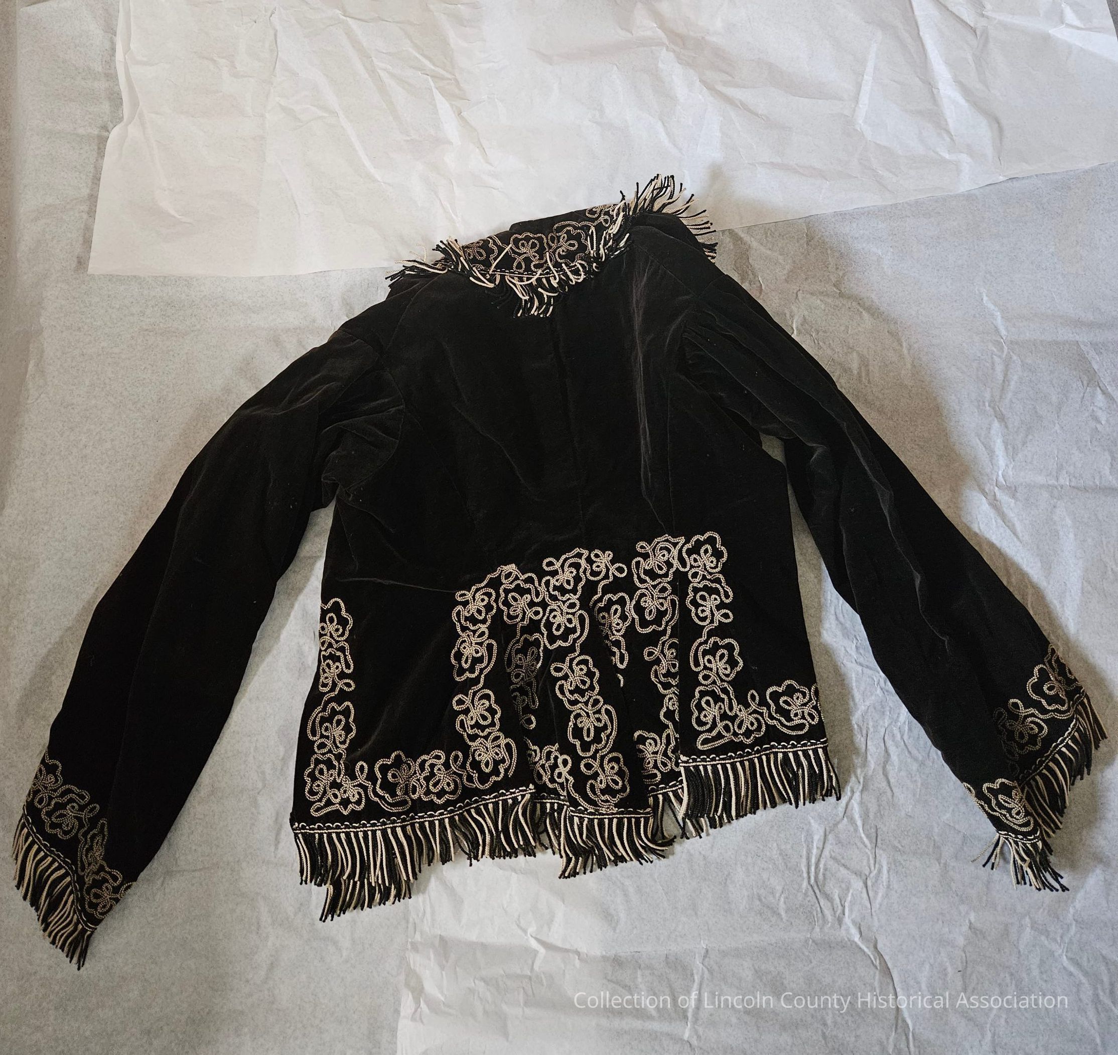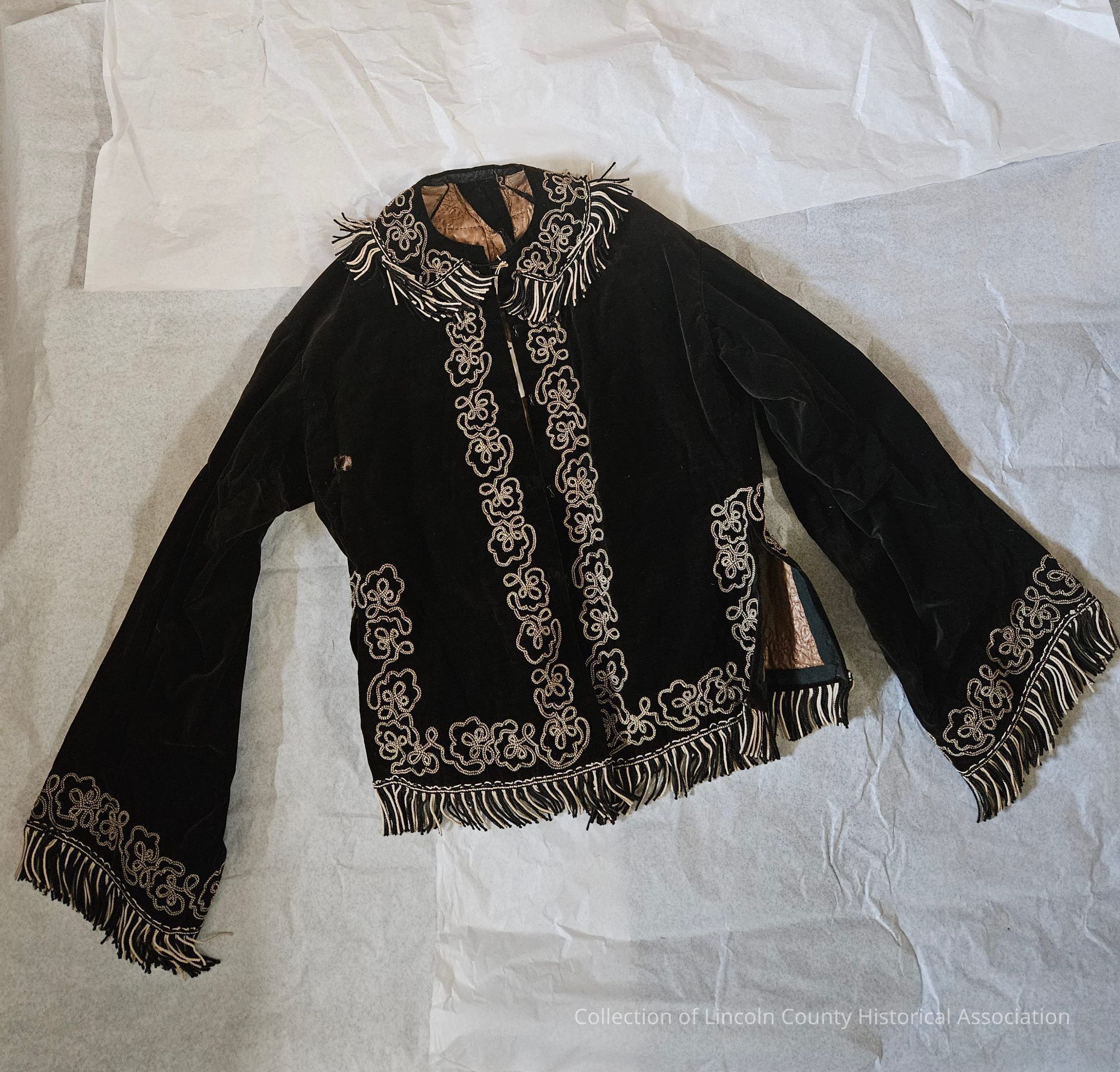 Brown velvet jacket with gimp trim. Embroidery down front of chest, around collar and cuffs, and around bottom and flaps in the back. Split back and split on each side. Beige and brown corded fringe. Polished cotton lining. Partially machine stitched and partially hand sewn.Clothing/Dress/Costume Details