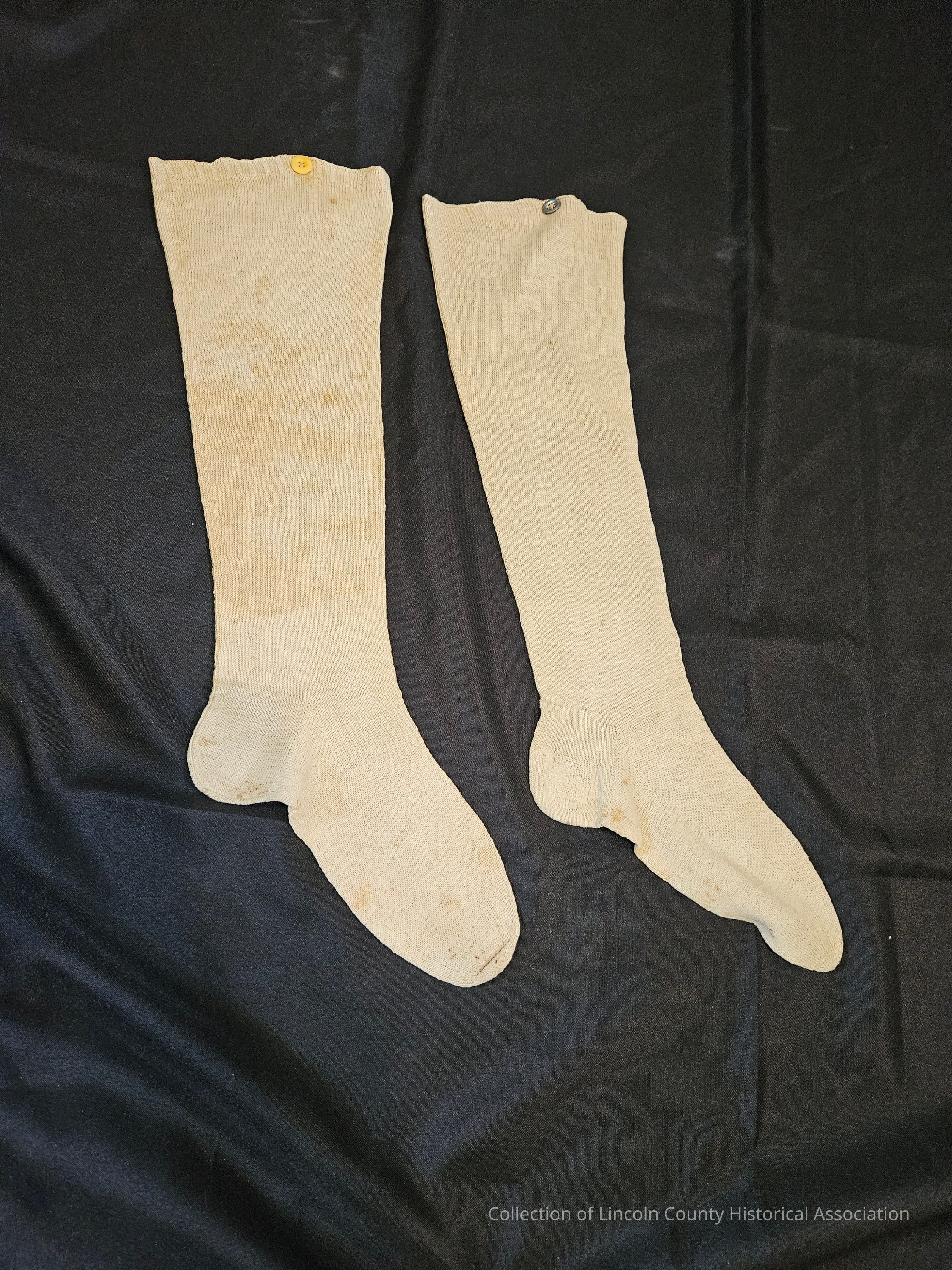 Pair of adult linen stockings. Linen thread and lisle weave. One stocking has a silver metal button and the other a yellow button. Stocking with metal button is darned at the heel.Clothing/Dress/Costume Details