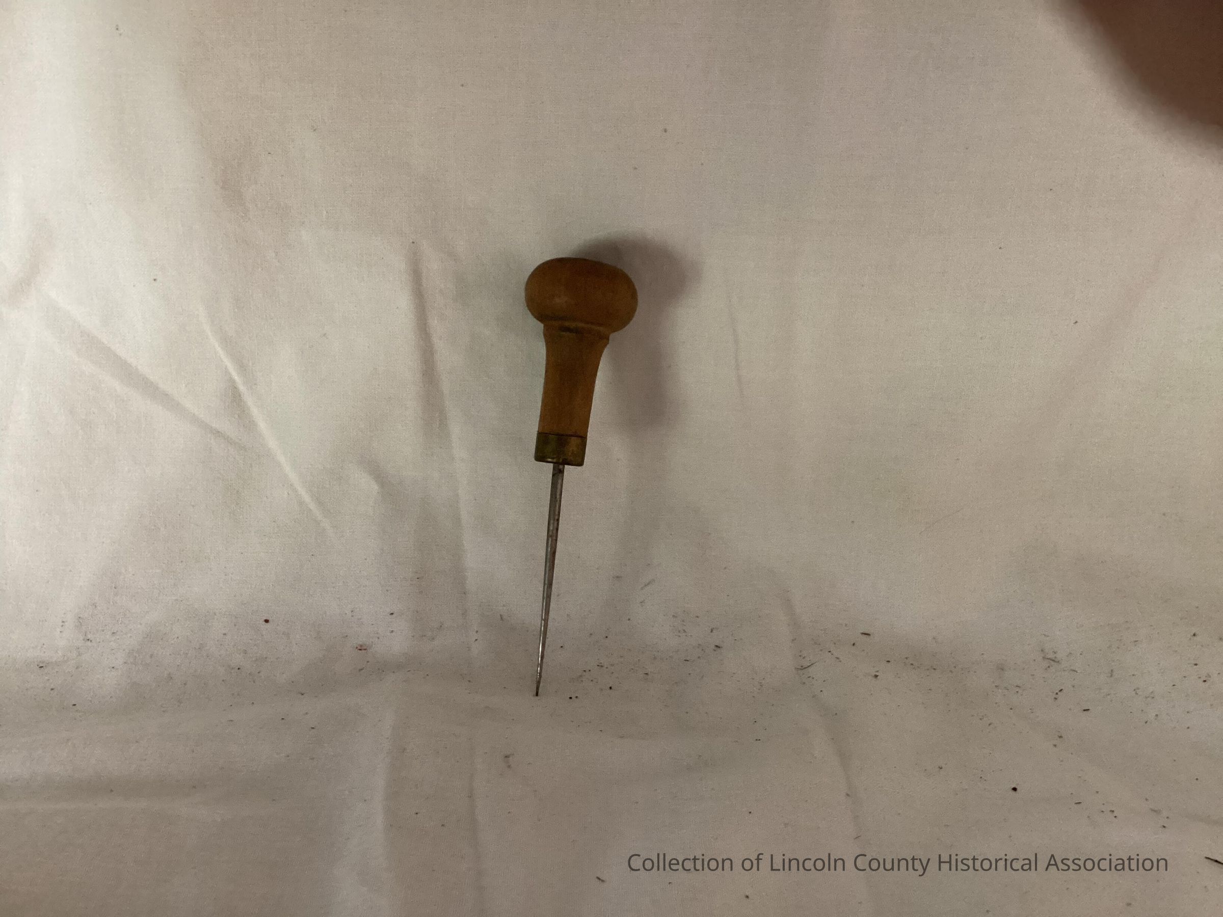 Round, tapering steel blade set into a wooden handle. Original top of blade has broken off