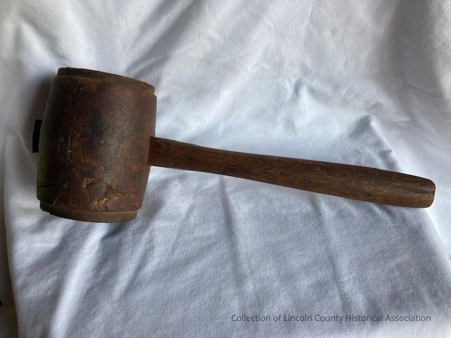 Round mallet with a turned drum-like head with recesses at both ends for now missing metal rings. Maple burl head with inset hickory handle that projects all the way through the head and which is wedged.