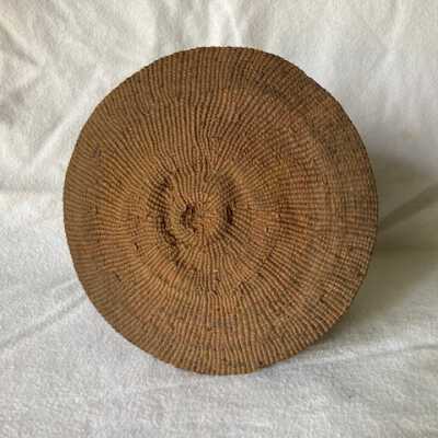 Cylindrical vegetable fiber basket with lid. Fibers colored in purple, blue, red, yellow, and brown. Braided handle. Lid is distorted in shape.Made/Created