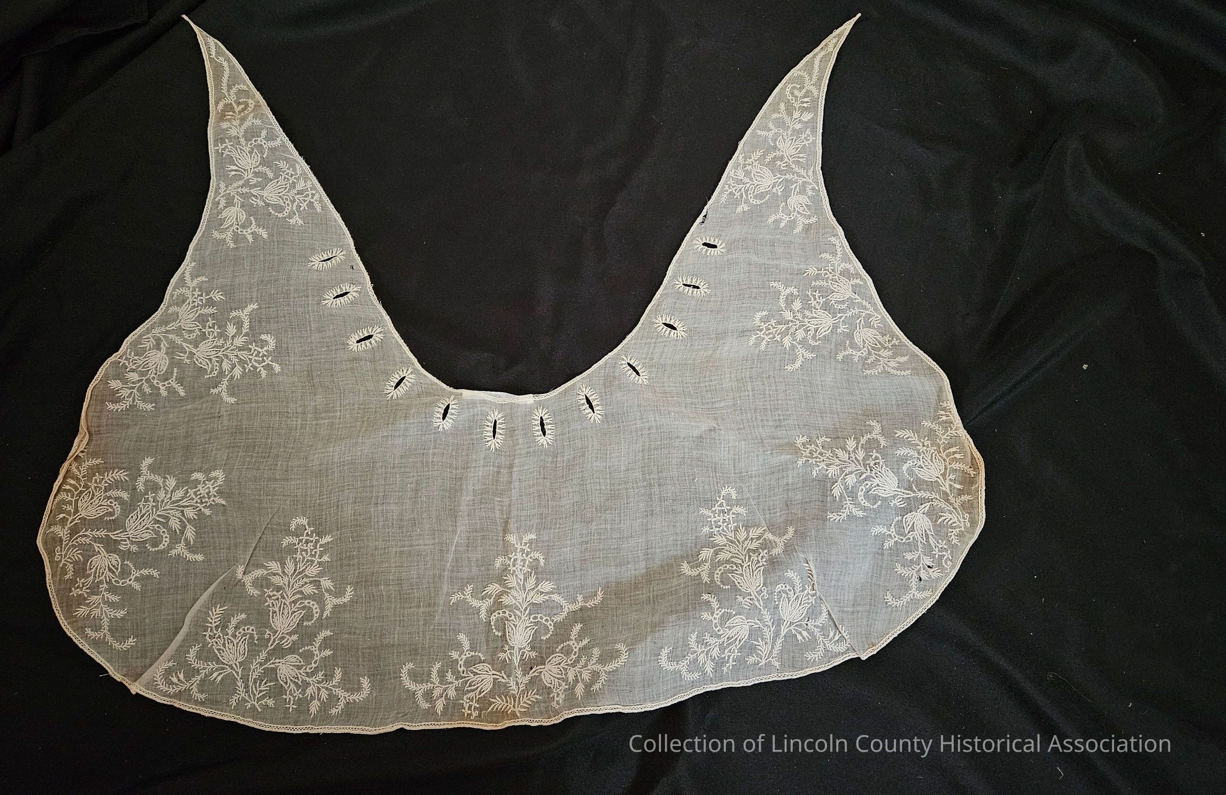 Thin white embroidered fichu/collar. Somewhat square in shape. Floral embroidery around bottom edge and sides. Button hole decorations around neck line. Machine made.Clothing/Dress/Costume Details