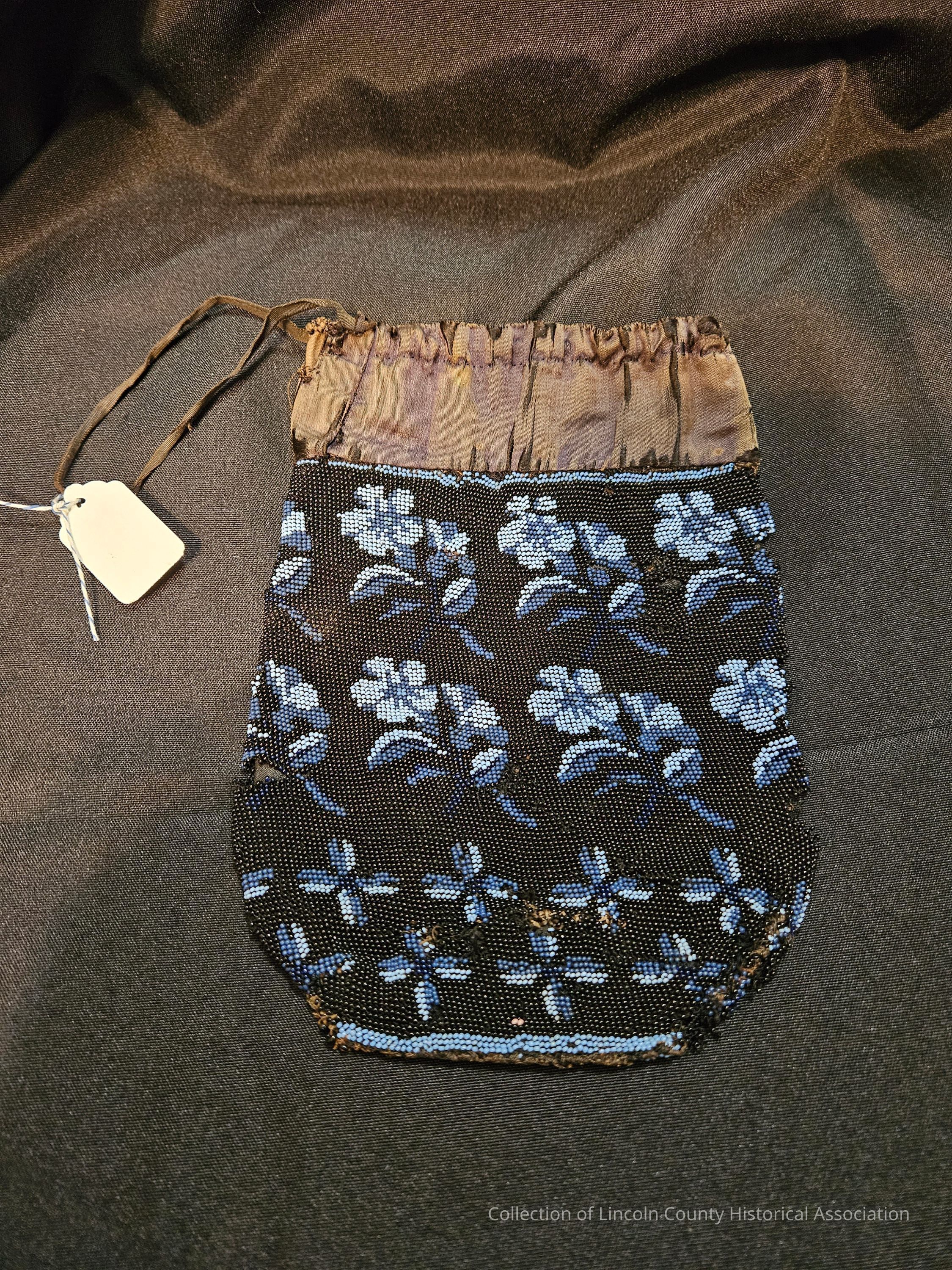 Beaded reticule. Drawstring pulls and brown silk fabric at top. Blue beaded floral designs on each side of bag.Made/Created
