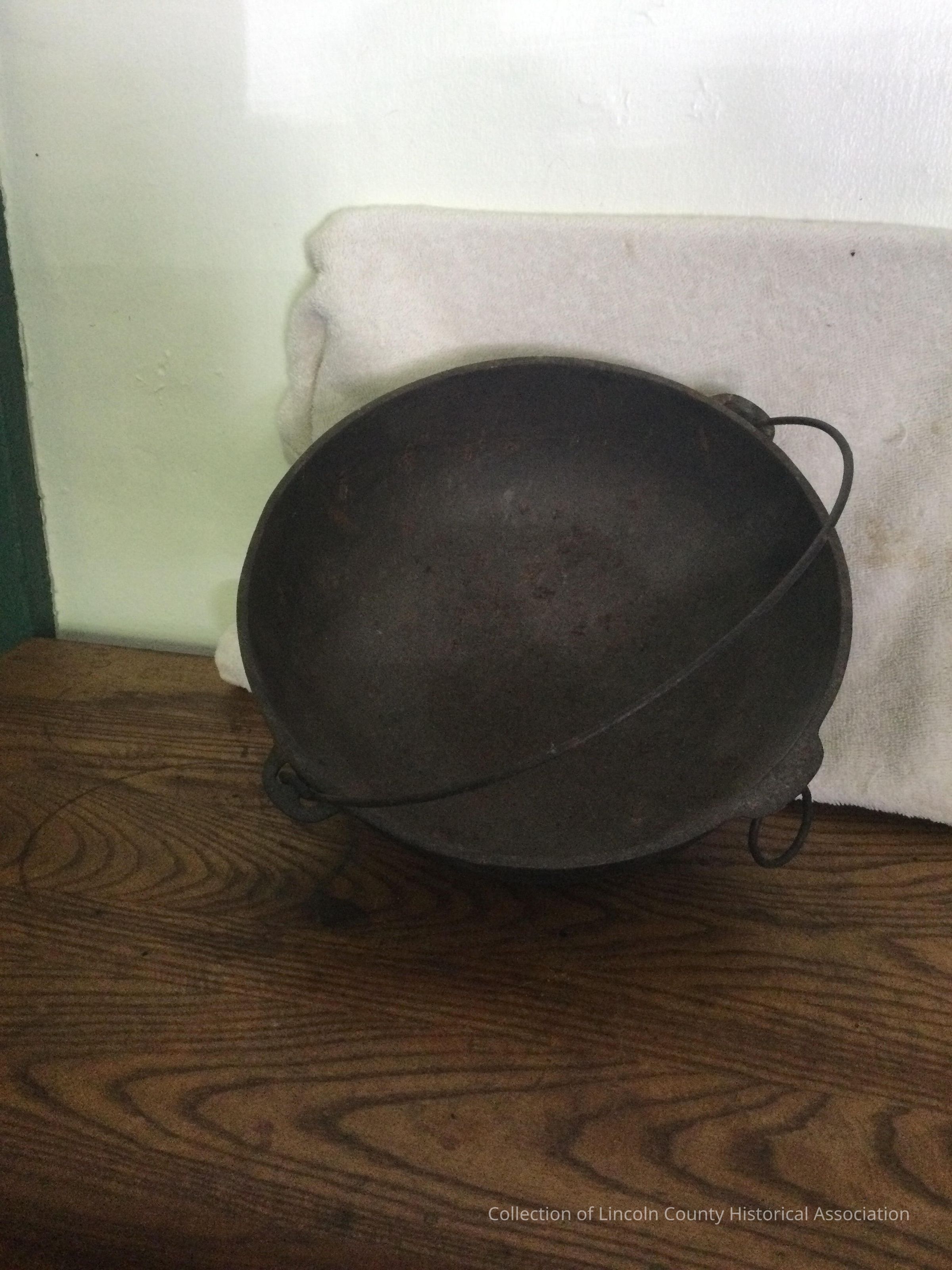 Iron kitchen pot with a handle set into loops and with a hanging hook (ring) at one side. This type of iron pot was designed to use on a stove.Made/Created