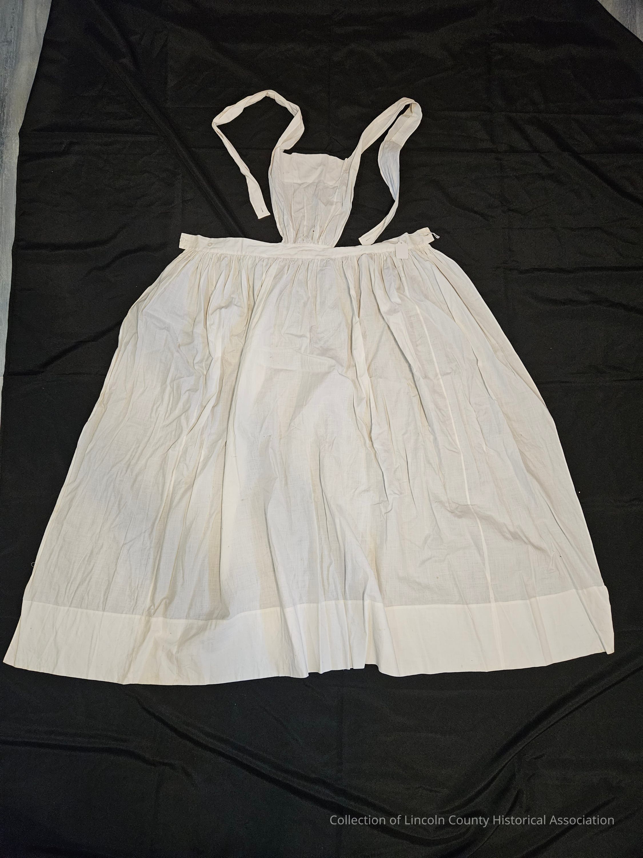 White cotton full-length apron/pinafore. Three buttons at waist. Two cotton ties at neck with buttonholes on the ends. Machine stitched.Clothing/Dress/Costume Details