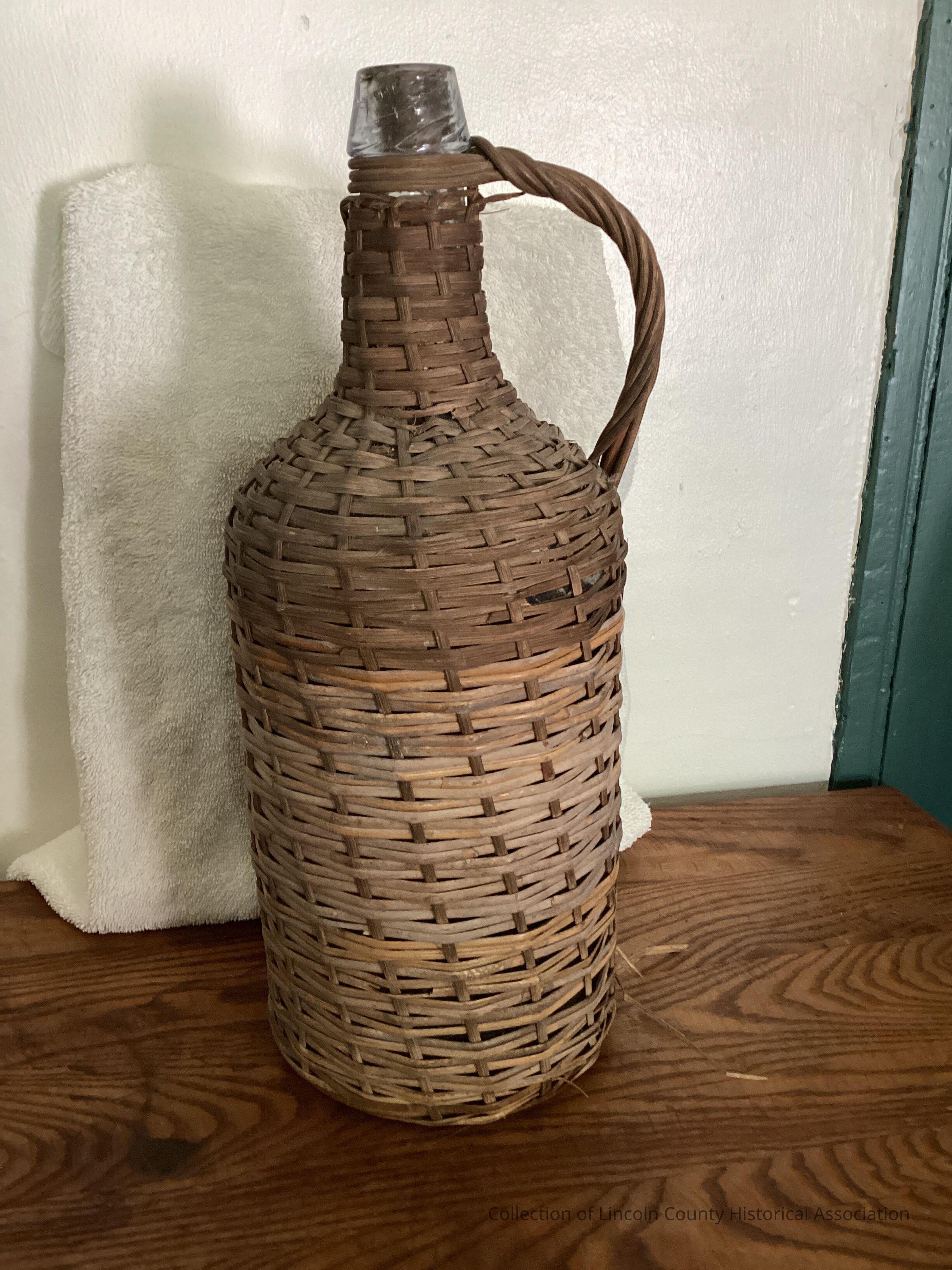 Clear glass bottle covered in wicker with a wicker loop handle.Made/Created