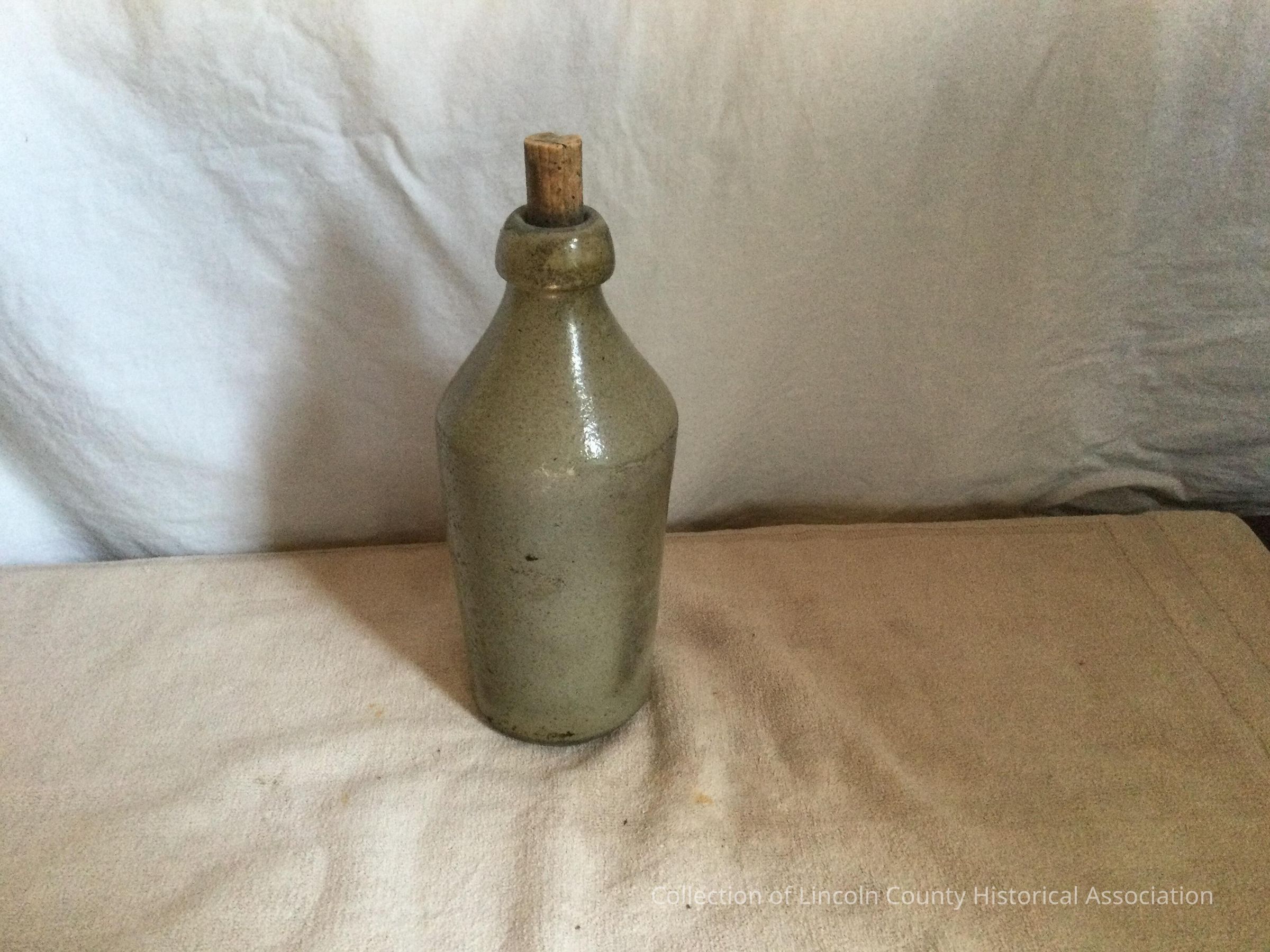 Stoneware bottle with a gray salt glaze. Has a distinct lipMade/Created