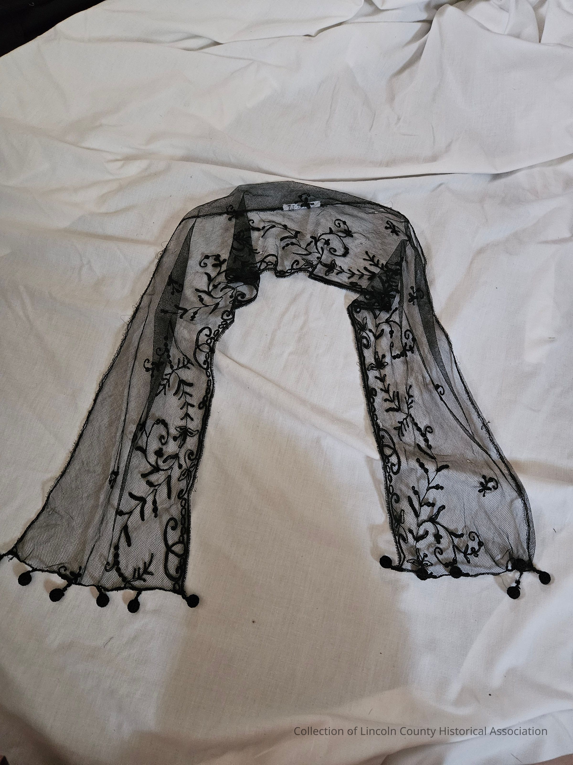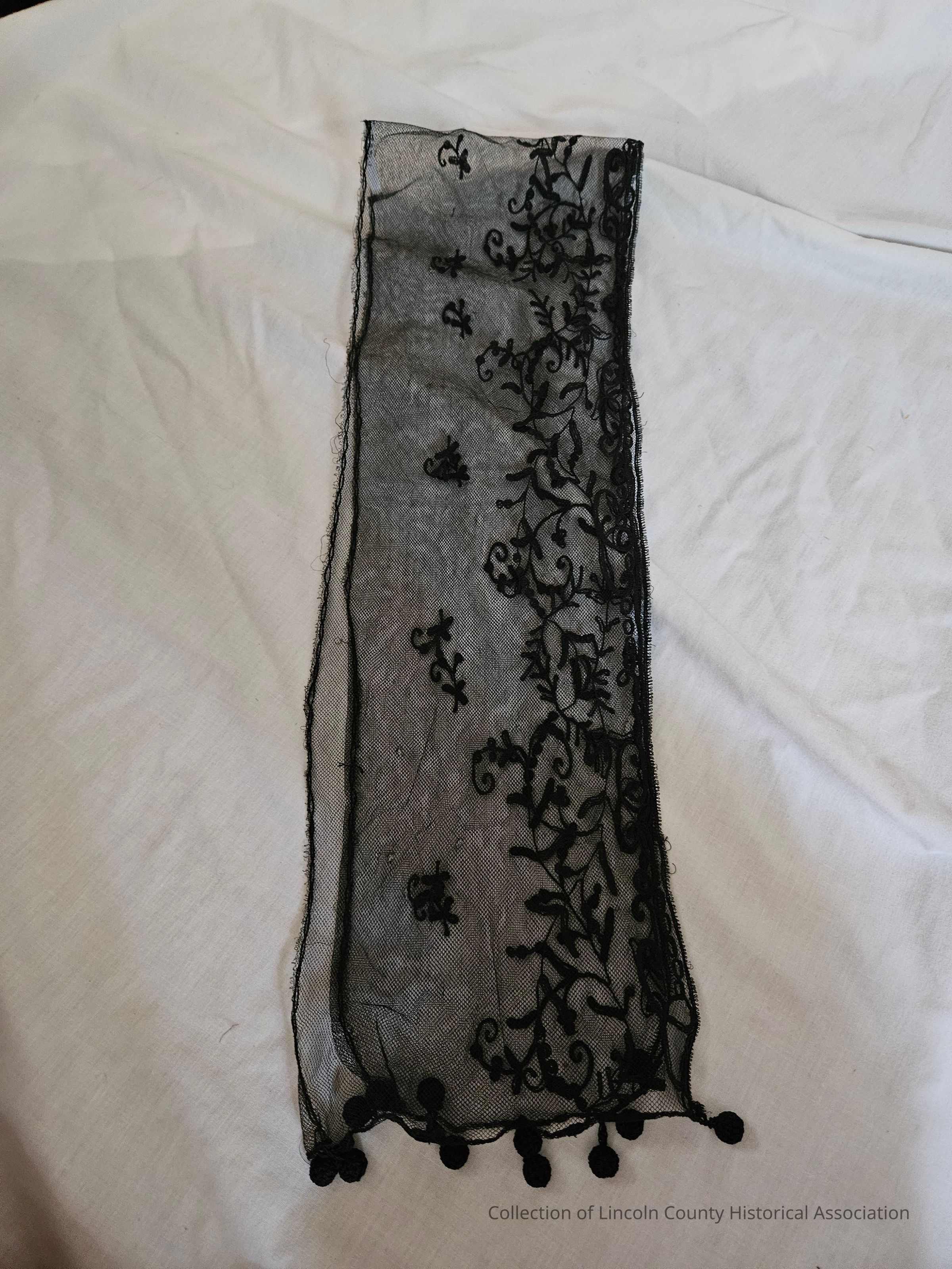 Black net/lace scarf with black floral embroidery. Round black tassels at each end.Clothing/Dress/Costume Details