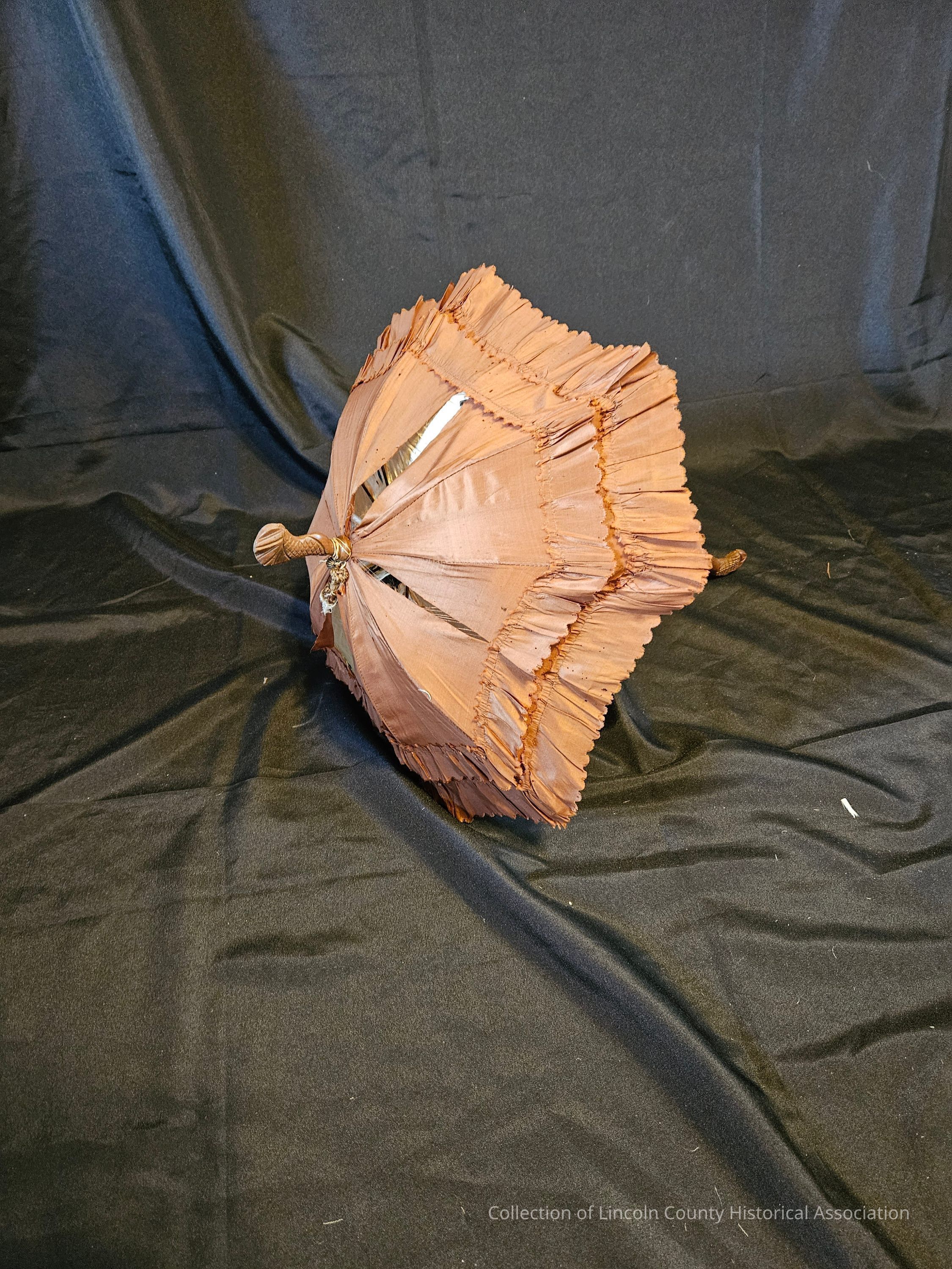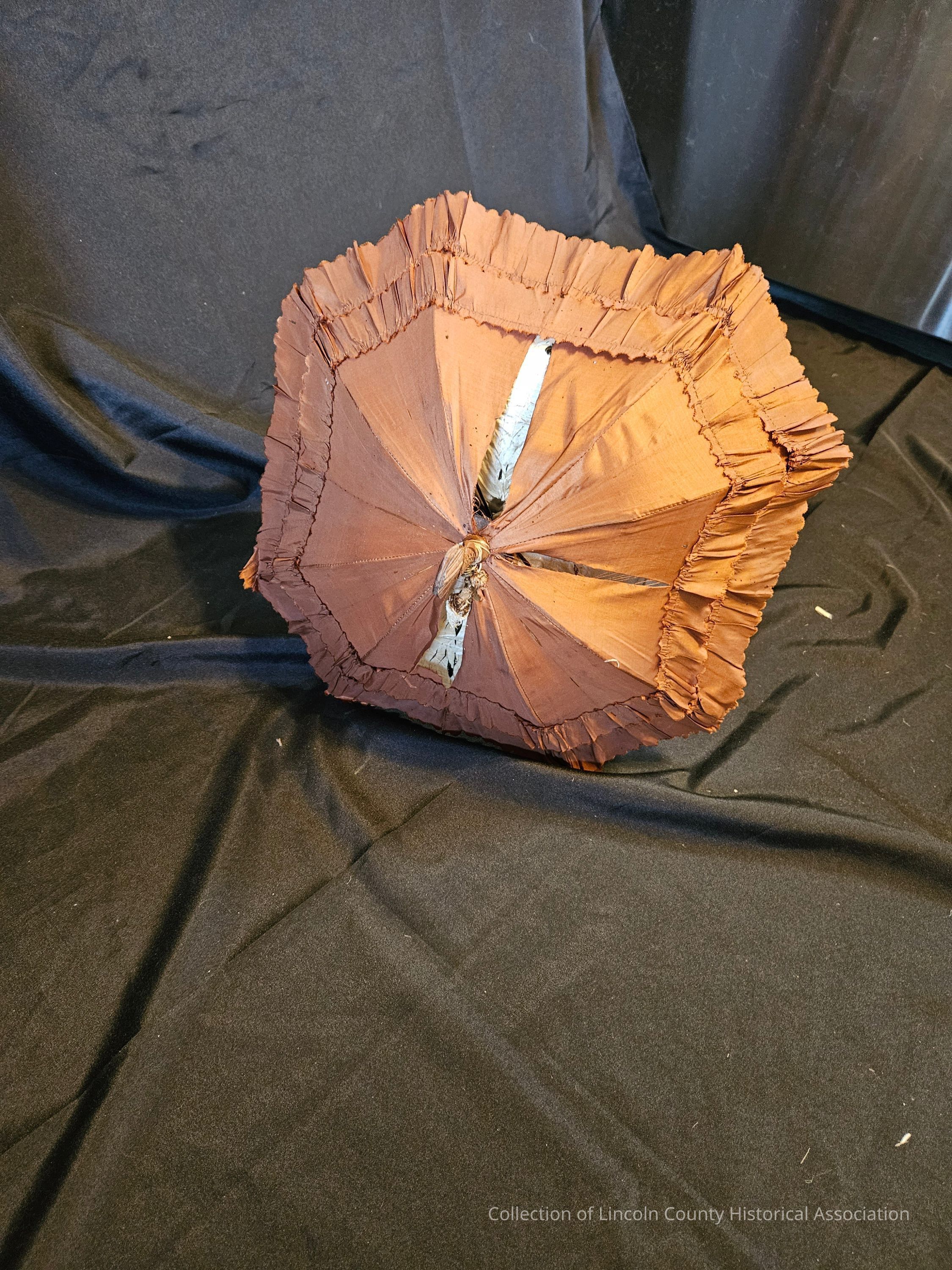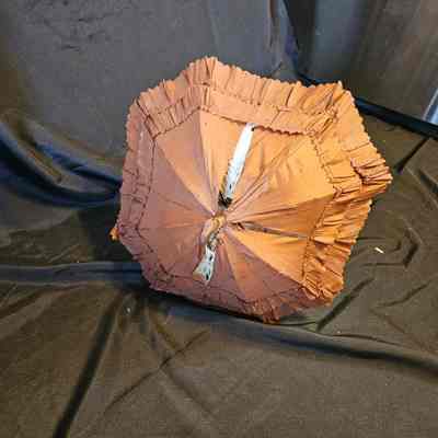 Small brown silk parasol/umbrella. White silk lining. Ruffled with scalloped edges. Carved and curved wooden handle. Carved wooden tip at top of umbrella with tassel. Metal ribs and top half of handle/shaft is metal.Made/Created