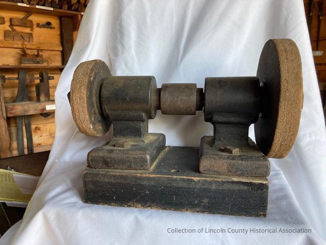 Double grindstone mounted on a cast iron pillow and set on a wooden block.