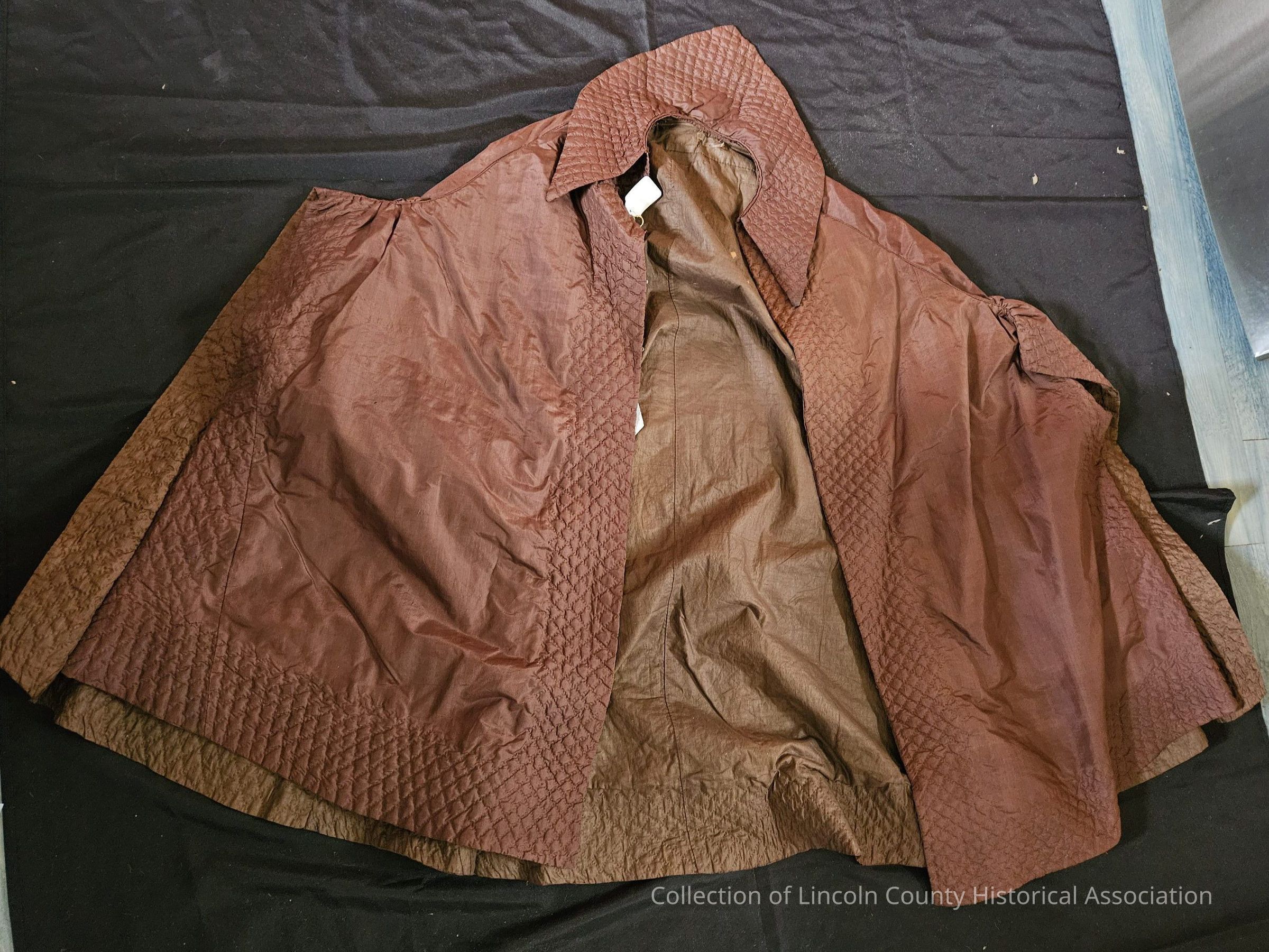 Brown silk hand quilted loose cape. Large arm openings. Folded-over collar. Polished cotton lining.Clothing/Dress/Costume Details