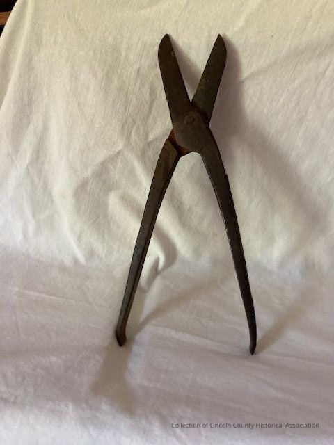 Forged steel tin snips. Two forged steel pieces riveted near cutting edges. With a handle that hooks onto the end.Made/Created