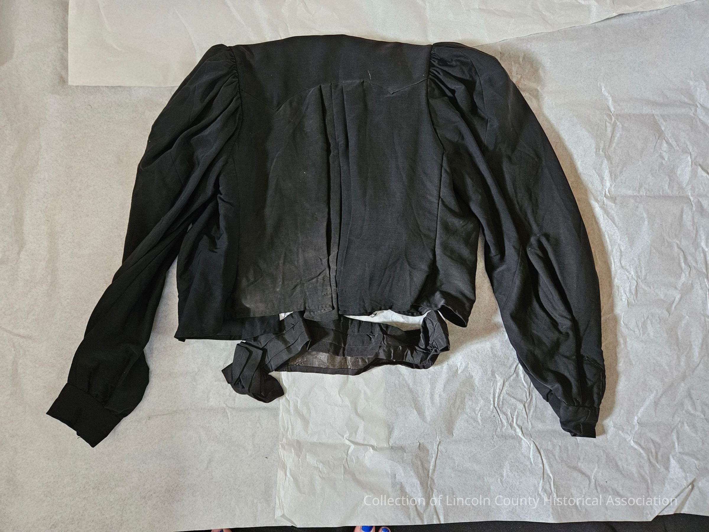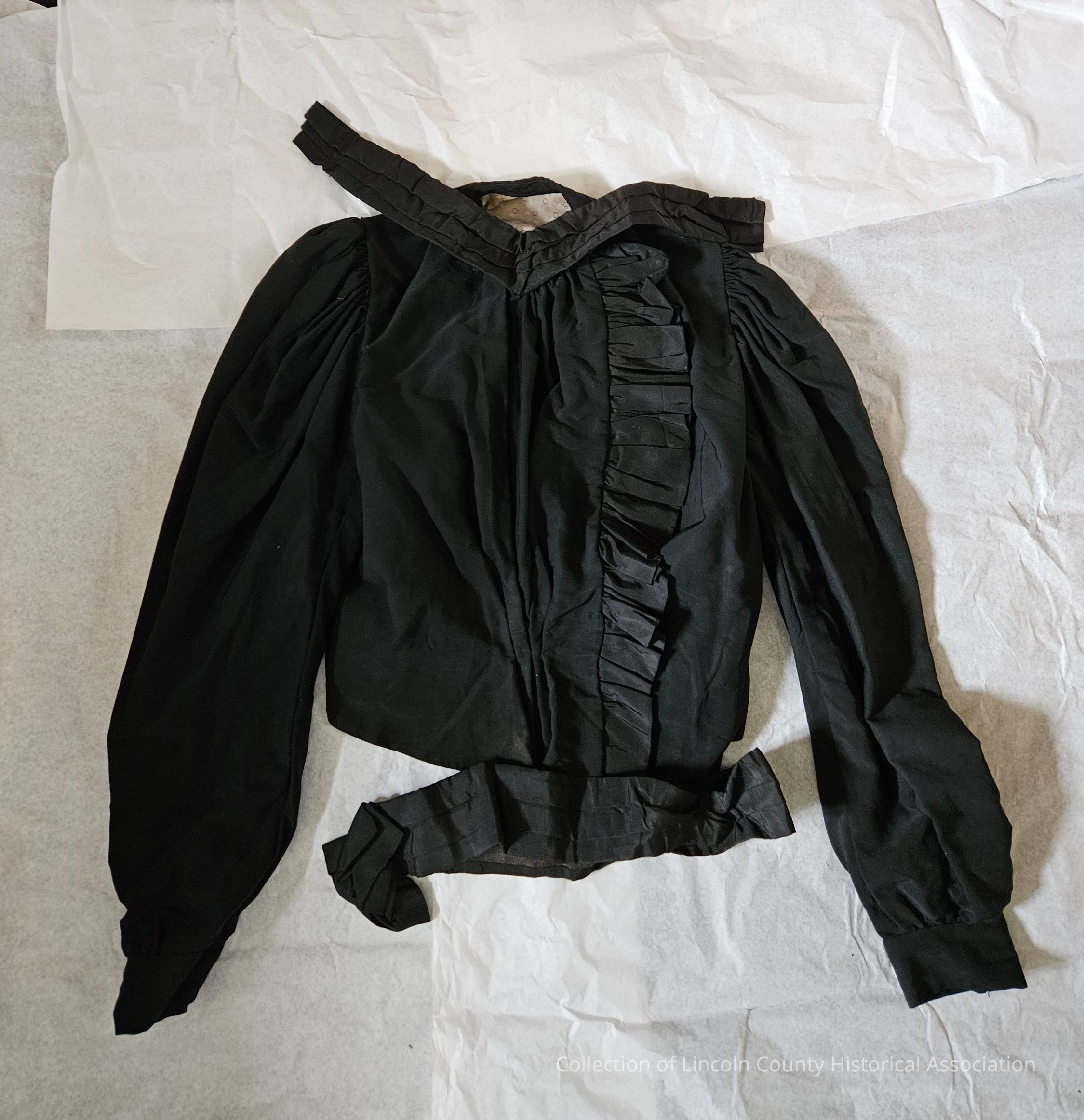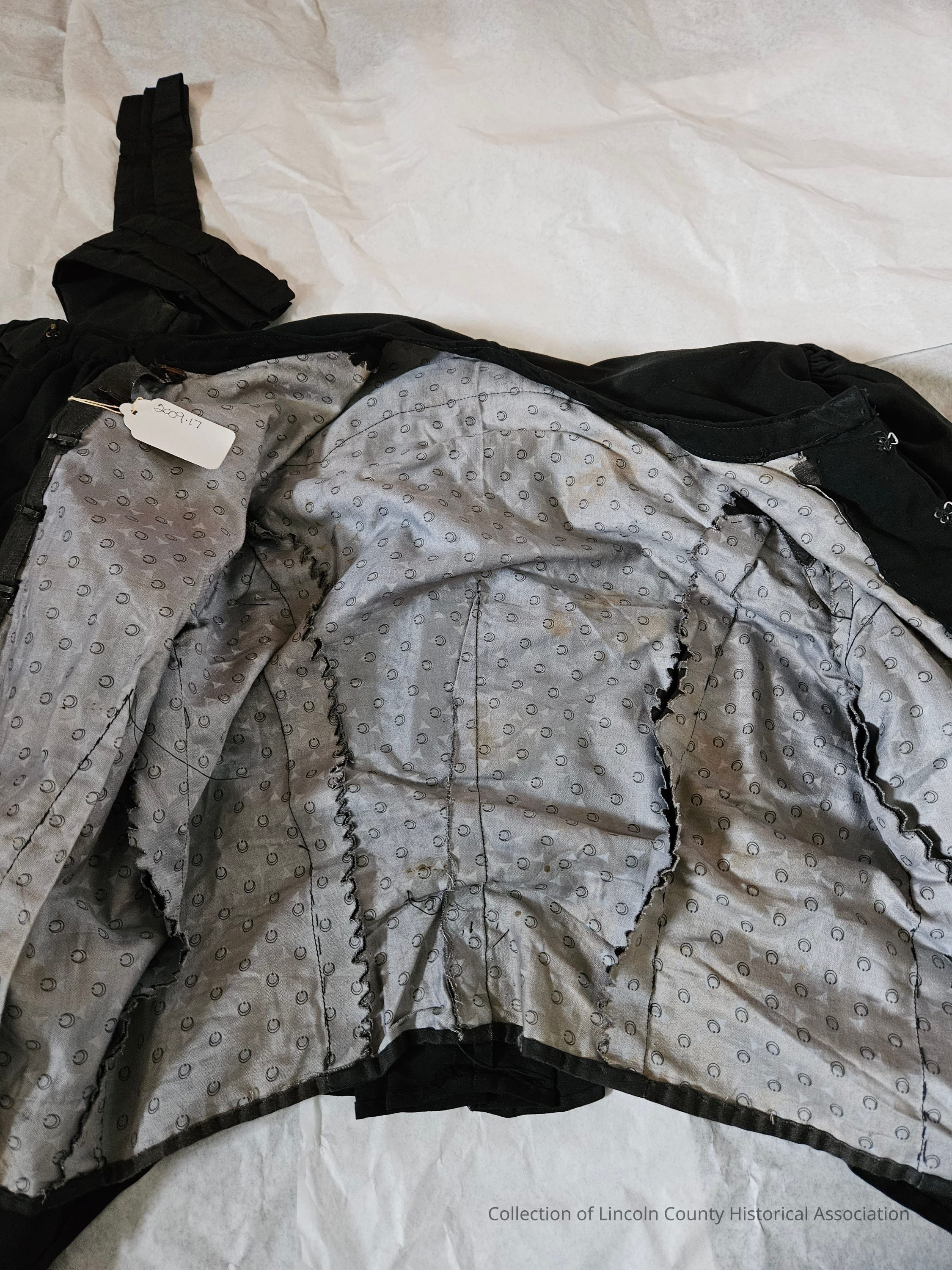 Black satin bodice with ruffle down the front. V-neck pleated collar. Pleated belt ending in a bow around waist. Metal clasp closures. Blue cotton moon patterned lining. Machine stitched.Clothing/Dress/Costume Details