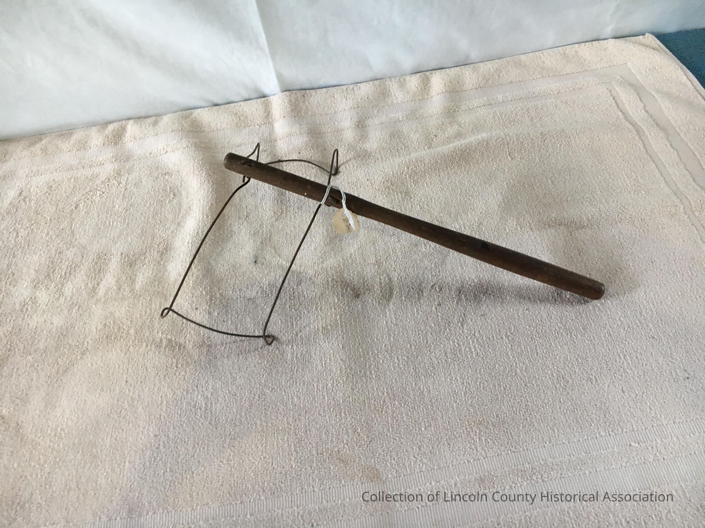 Dowel like wooden handle with 2 bent wire attachments to lift pie from oven
